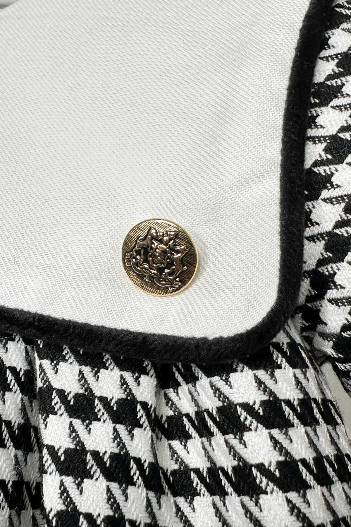 This beautiful romper from Fofettes x Be Chic captures the timeless elegance of classic children’s wear. Crafted from soft woven houndstooth in black and white, it features a statement white sailor-style collar trimmed with black velvet piping and adorned with two gold-tone vintage-style buttons. Elasticated wrists and legs offer gentle comfort for little ones on the move, while the cotton lining keeps it soft against delicate skin. Thoughtfully designed mother-of-pearl button fastenings run down the back and across the crutch for easy dressing and nappy changes – because practicality should never mean compromising on charm. A piece to treasure, perfect for autumn outings, family gatherings, and those “just because” photo moments.