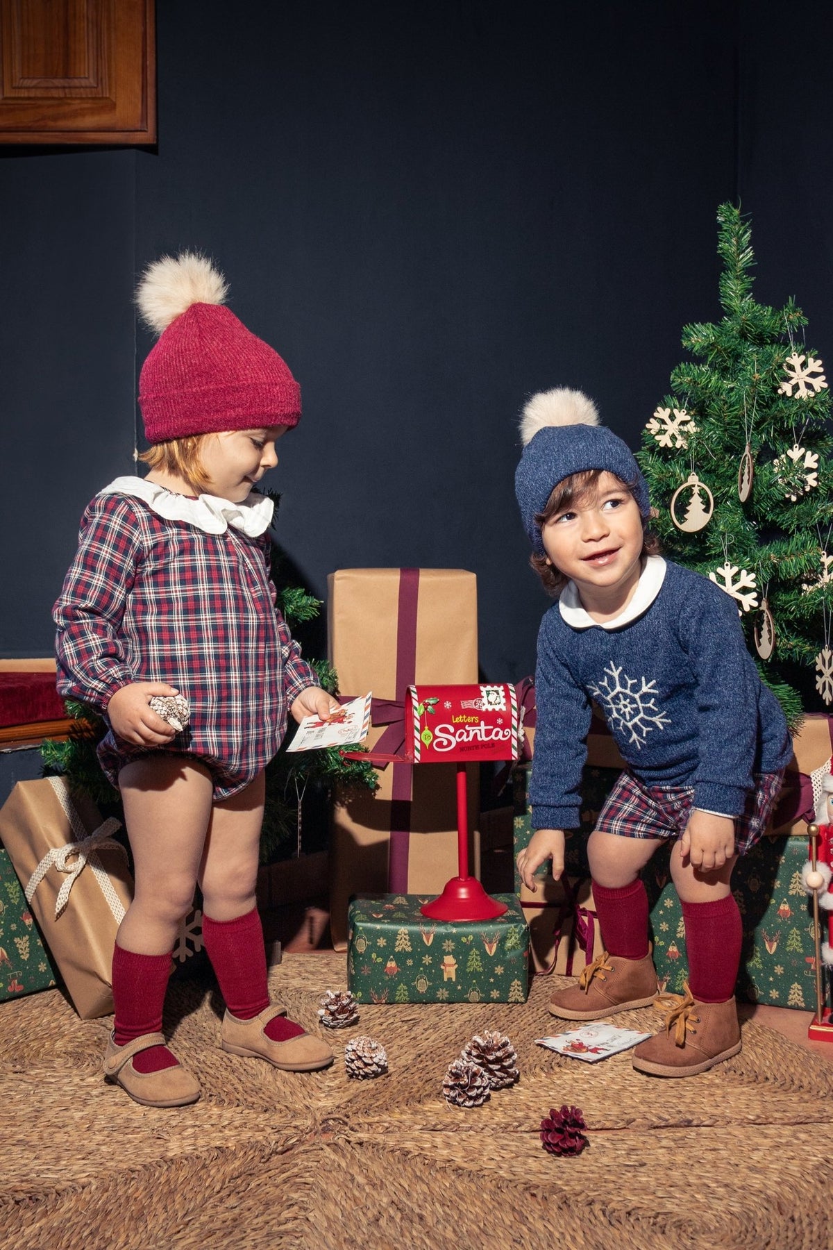 There’s something undeniably nostalgic about this piece from Calamaro – like something you'd spot in an old photograph, worn by a baby sitting wide-eyed by the tree. Made from soft, super lightweight tartan cotton in festive shades of navy, red and white, this unisex romper is topped with a showstopping pleated white collar for a classic Christmas finish. The gently elasticated cuffs and legs keep your little one comfortable all day long, while pearlised buttons down the back and crutch make changes a breeze. Pair with tights or knee socks and a cardigan to complete the look.