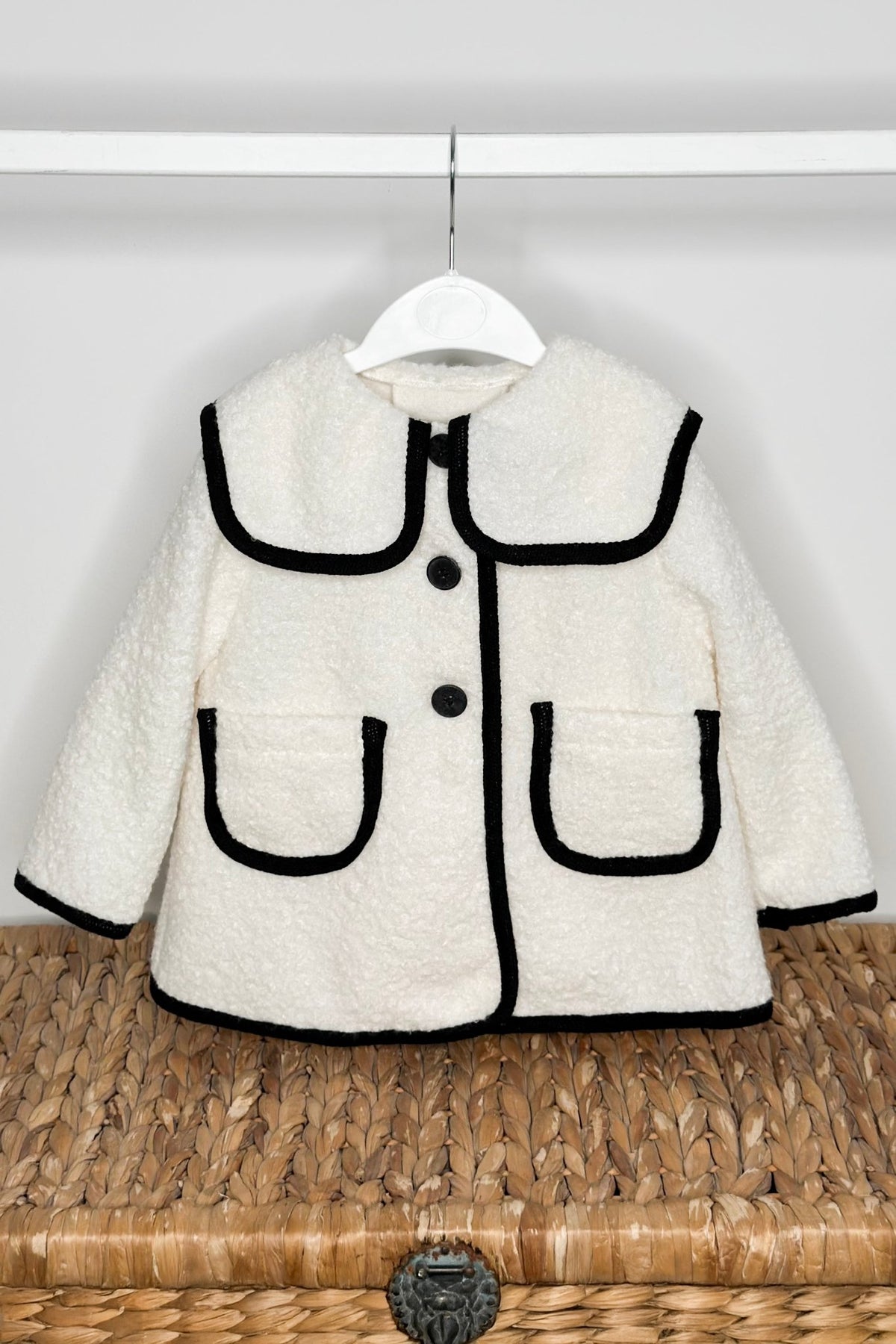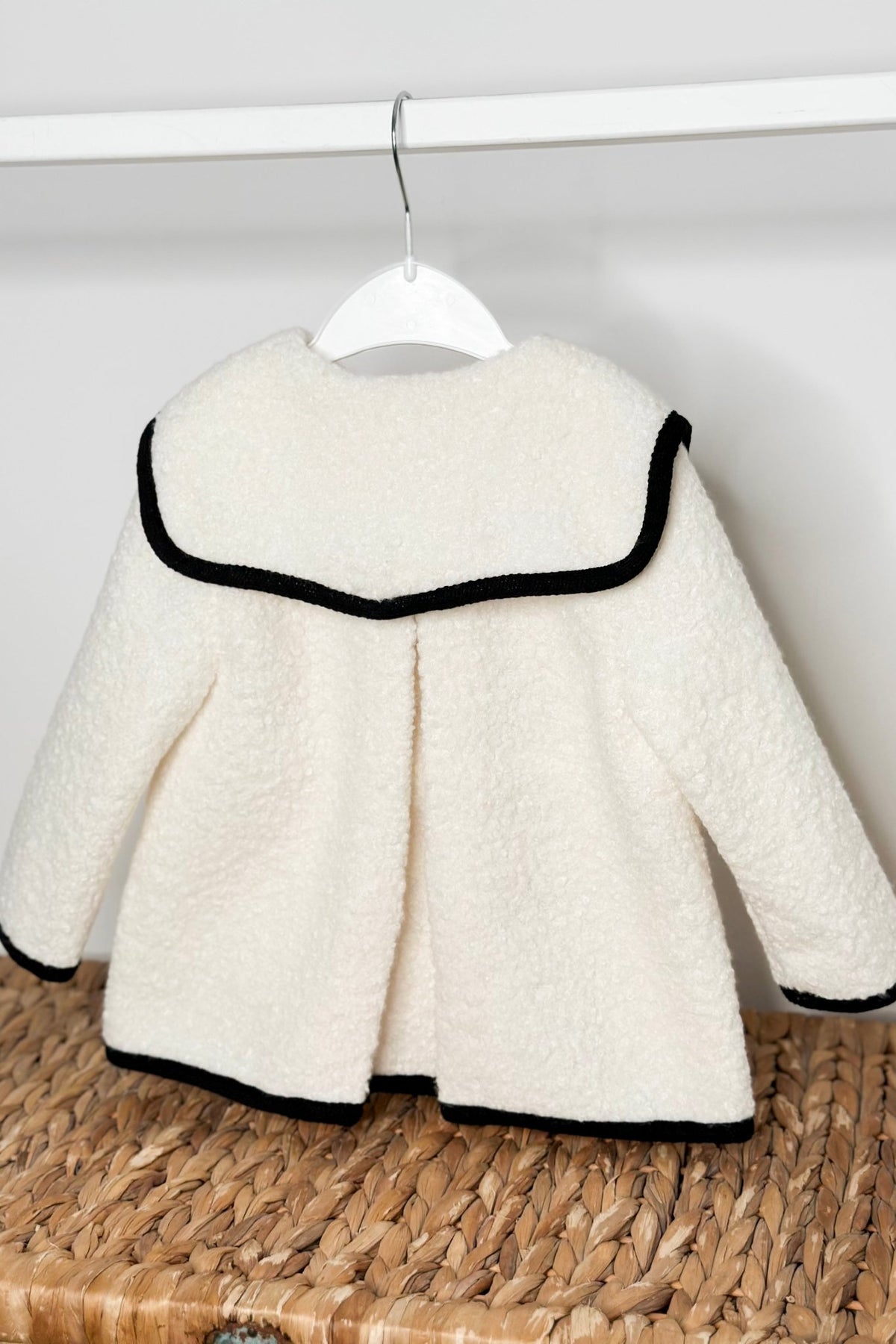 A timeless showpiece for little wardrobes – the Remi coat from Fofettes x Be Chic blends elegance and comfort in perfect harmony. Crafted from a soft ivory bouclé fabric, it features a large square sailor-style collar and striking black trims for a classic monochrome finish. Practical yet refined, it’s designed with front pockets, lightweight warmth and a relaxed fit ideal for layering over any winter outfit. Fastened with glossy black buttons, this versatile coat makes a stylish statement for both girls and boys.