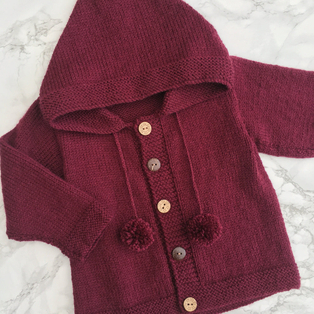 هودي محبوك باللون العنابي الرائع مع كرات صوفية متناسقة رائعة وأزرار خشبية متباينة.