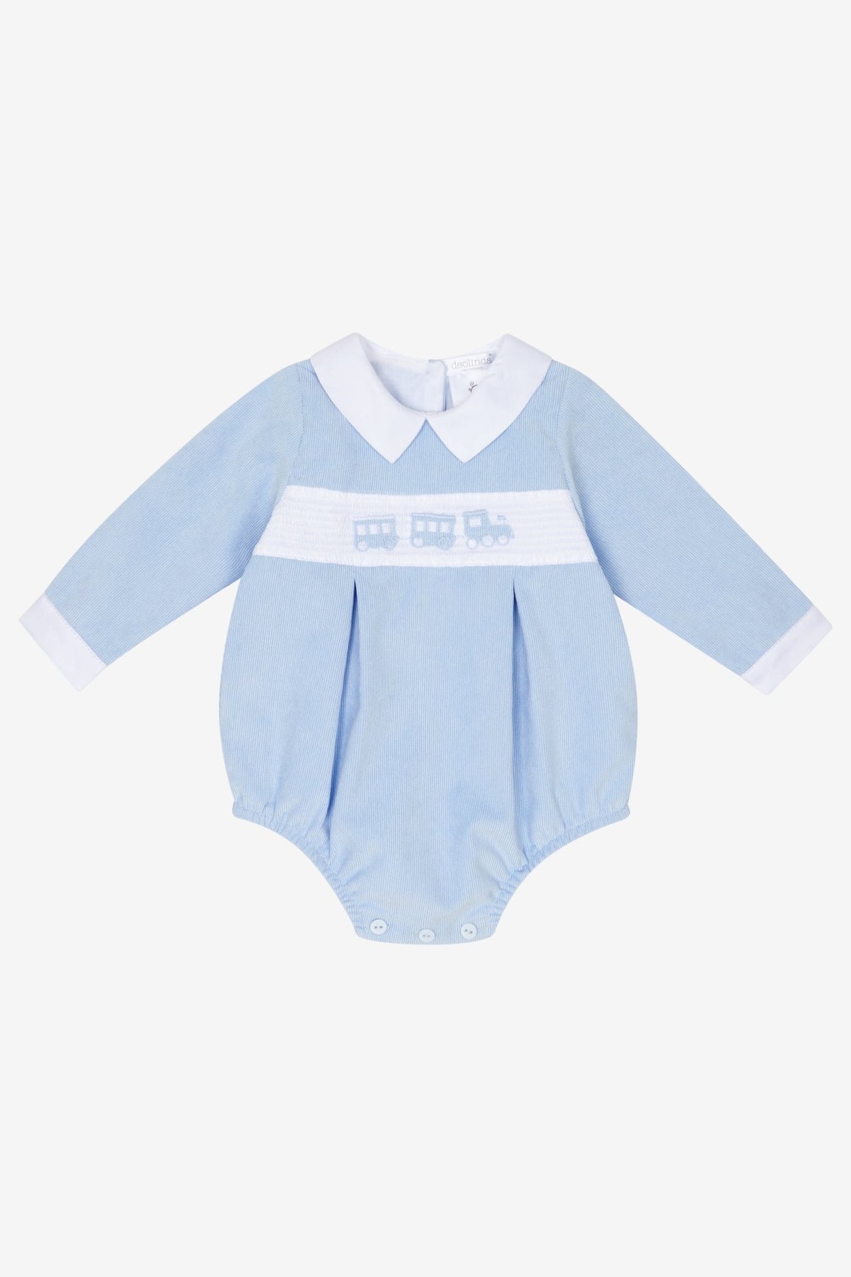 All aboard for timeless style. This cloud-blue romper from Deolinda is crafted from the softest needlecord, making it warm yet lightweight for your baby boy. The crisp white collar and cuffs add a polished finish, while the hand-smocked train detail across the chest brings a playful touch of nostalgia. Fully cotton-lined for comfort, with button fastenings at the back, wrists, and crutch for easy changes, and elasticated legs for a snug fit. A beautiful piece for everyday wear or special occasions.