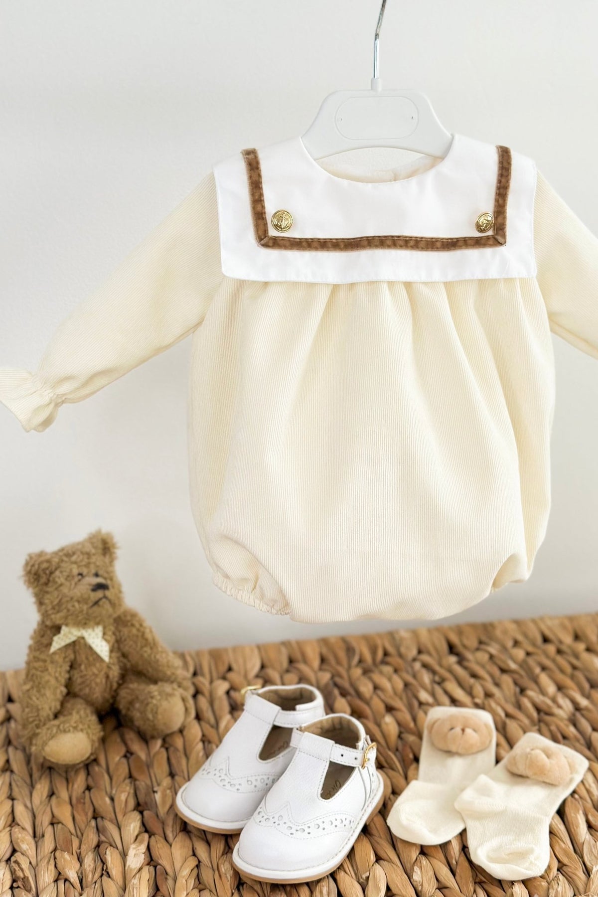 A little piece of vintage charm for your baby boy. This beautifully made Puro Mimo romper is crafted from the softest cream needlecord – gentle against delicate skin, yet warm enough for cooler days. Its crisp white collar, framed with a velvet trim and two gold anchor buttons, gives a nod to classic sailor styling while keeping the look timeless and refined. Fully lined for comfort and finished with easy pearlised button fastenings, it’s a piece that turns everyday moments into keepsake memories.