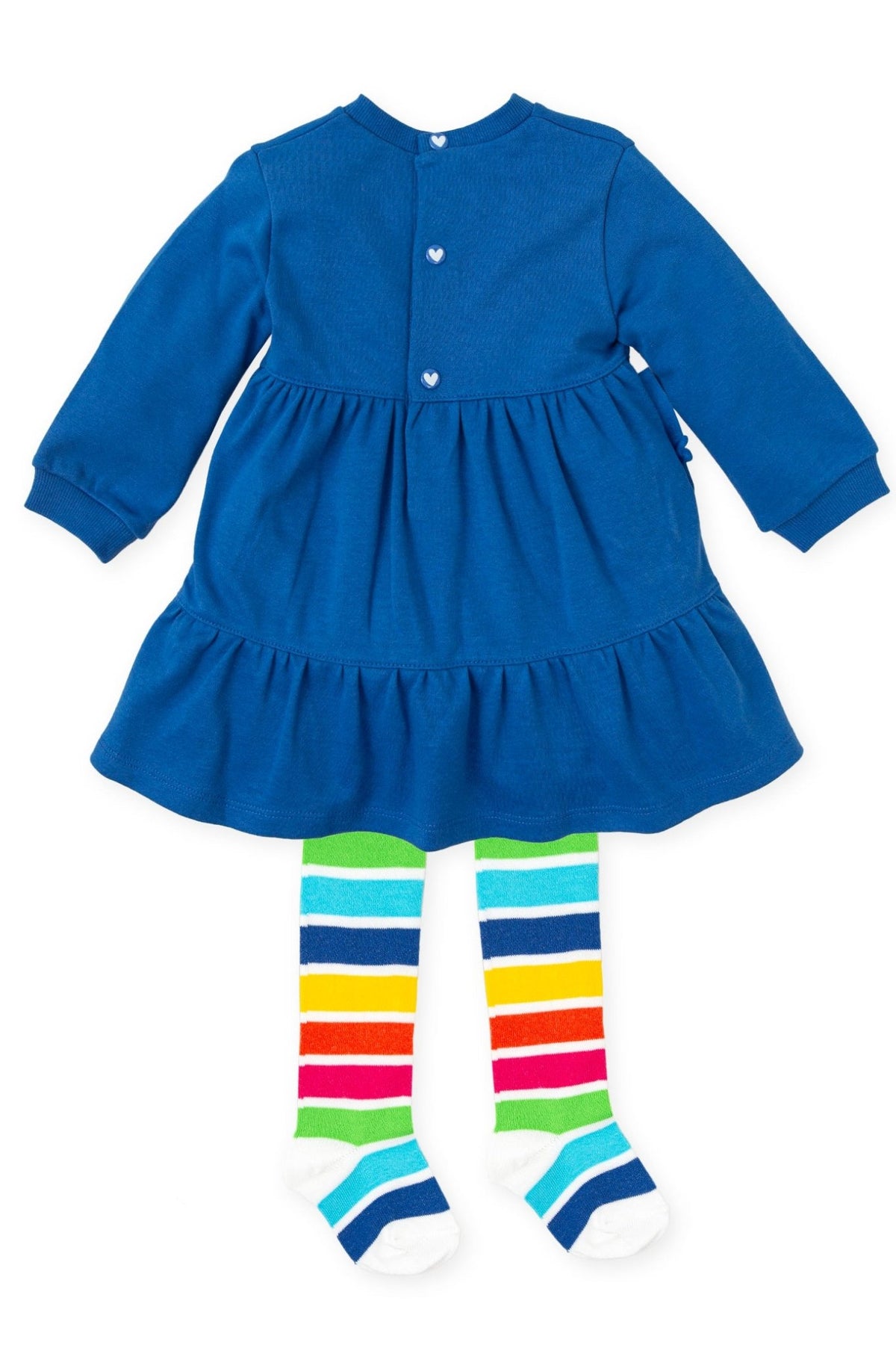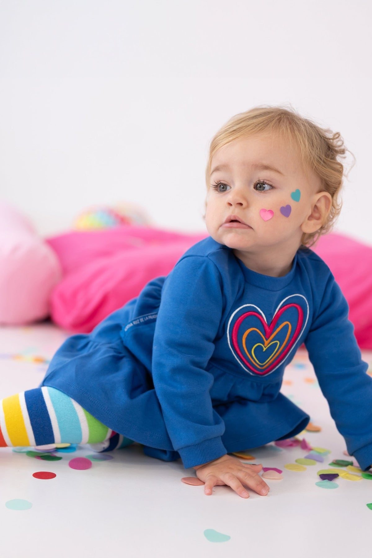 طقم فساتين بناتي من العلامة الإسبانية أغاثا رويز دي لا برادا . فستان أزرق ملكي متوسط الوزن، متعدد الطبقات، بأكمام طويلة، مطرز بقلوب متعددة الألوان على الصدر، مع جوارب طويلة مخططة بألوان قوس قزح متباينة.