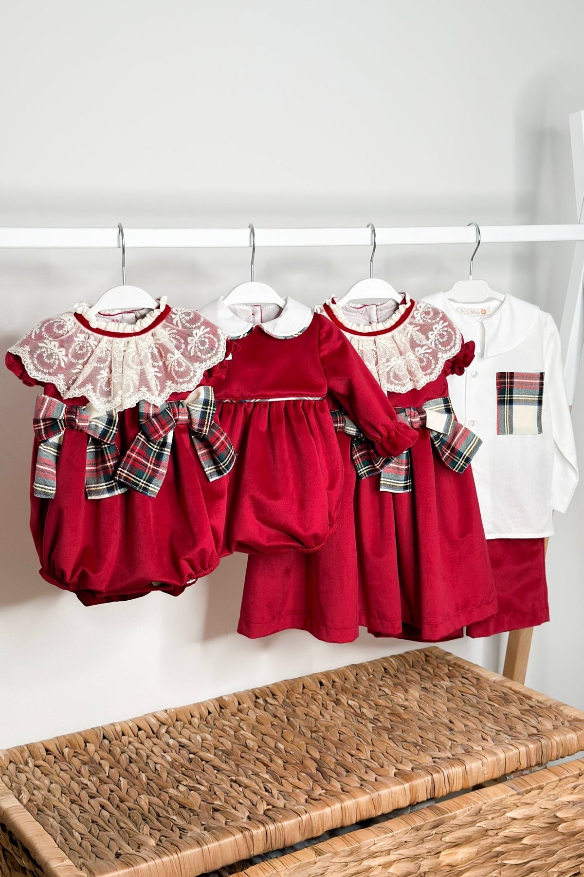 The magic of Christmas, captured in a romper. This buttery-soft red velvet piece from Puro Mimo is the kind you can’t stop touching – velvety smooth, sumptuously lined, and made for those picture-perfect moments by the tree. The intricate ivory lace collar brings vintage elegance, while two statement tartan bows at the waist add a playful festive charm. Finished with mother-of-pearl buttons and gentle elastic at the sleeves and legs, it’s a timeless piece designed for your little one’s most special winter days.