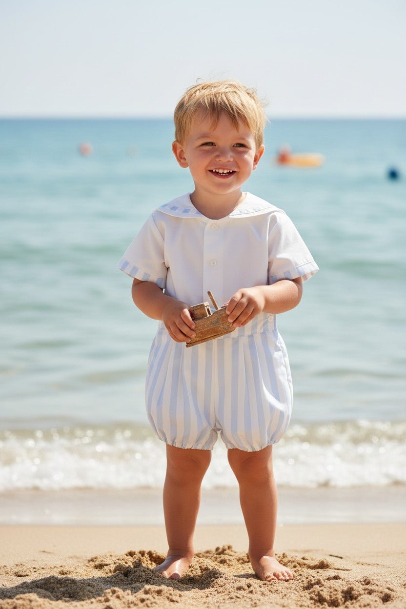 If you love those timeless, traditional outfits that make your little one look instantly put together, this charming Puro Mimo set is a beautiful choice. The crisp white sailor-collar shirt pairs perfectly with the soft blue and white striped jam pants, creating a classic look that feels both smart and playful. Made from lightweight, breathable cotton, it’s designed to keep your little boy comfortable on warm days, whether he’s toddling around on holiday, attending a family celebration, or simply enjoying a sunny afternoon out. Thoughtful details like pearlised buttons and gently elasticated jam pants make dressing easy while keeping everything comfortably in place.
