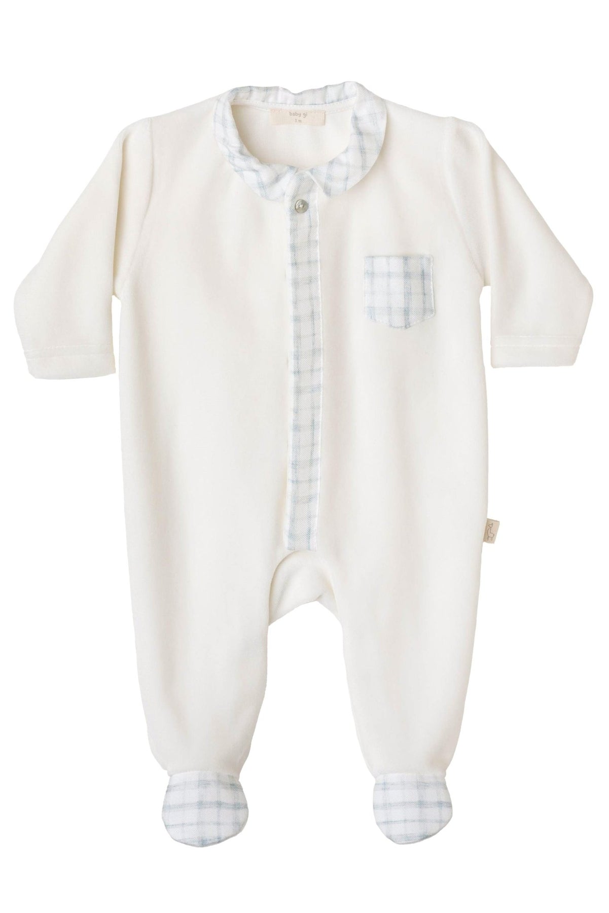 بدلة نوم مخملية للأولاد من ماركة بيبي جي البرتغالية. بدلة نوم مخملية ناعمة بلون عاجي، بياقة قطنية منقوشة باللون الأزرق الداكن، وفتحة في المنتصف، وجيب، وأصابع.