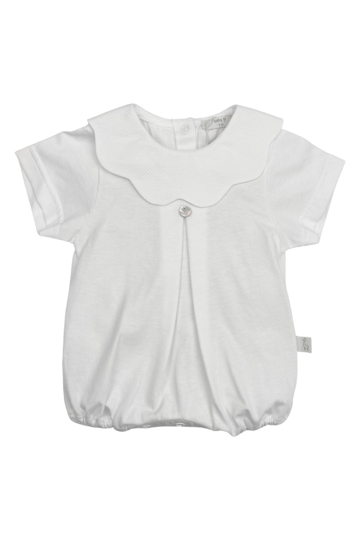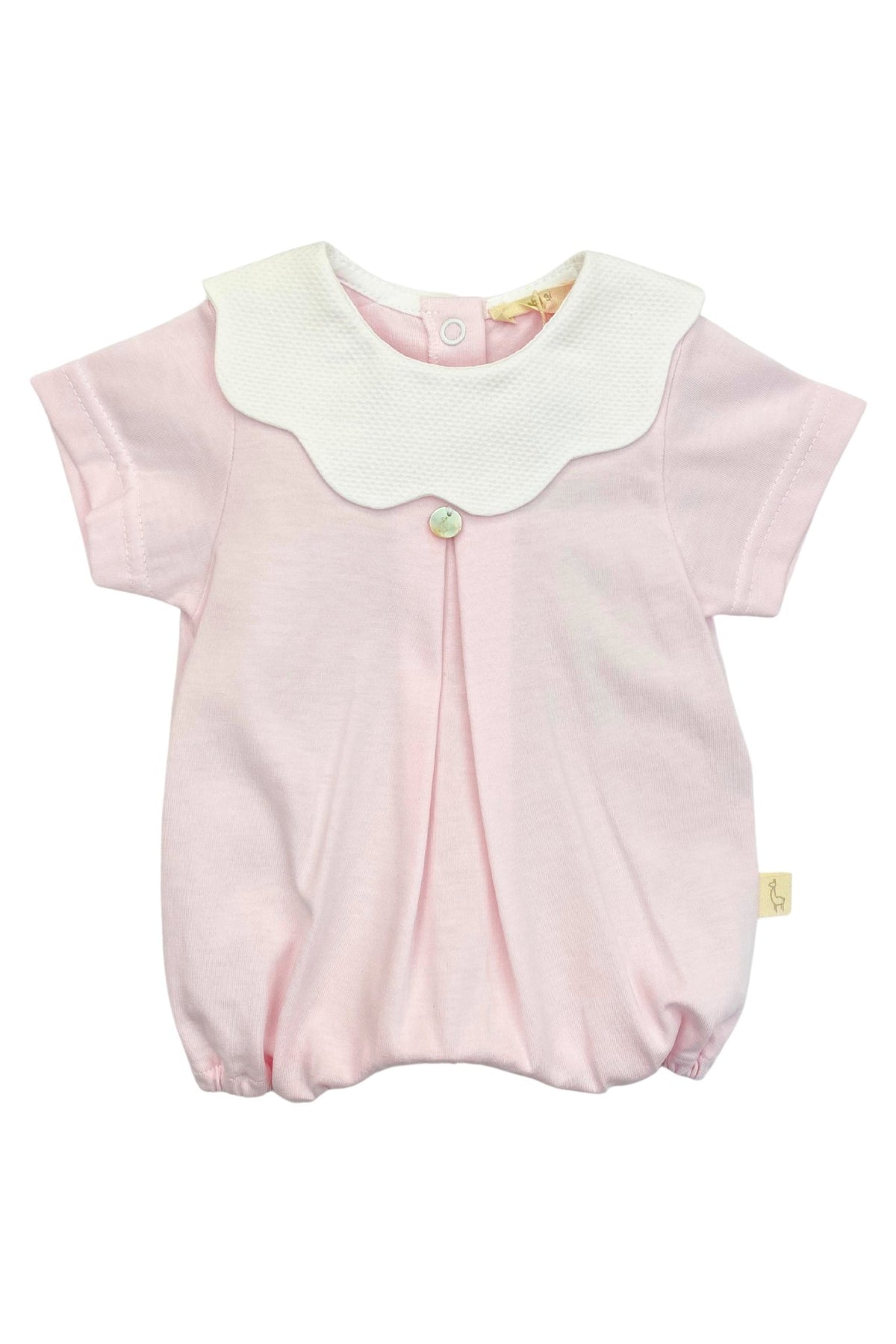 رومبير رائع للجنسين من ماركة بيبي جي البرتغالية. رومبير قطني ناعم وخفيف الوزن، بياقة واسعة من قطن بيكيه، مزين بقرص فاخر من عرق اللؤلؤ الطبيعي يحمل العلامة التجارية في المنتصف.