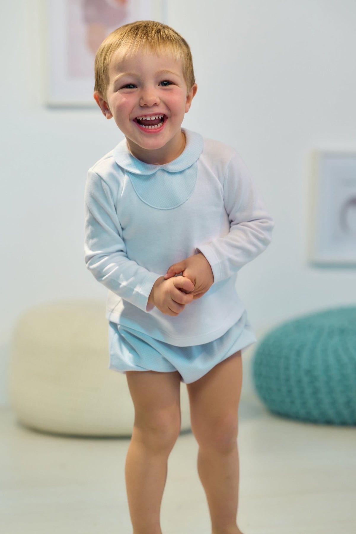 طقم ملابس للأولاد من مجموعة خريف/شتاء 2023 للعلامة التجارية الإسبانية رابيف . بلوزة بيضاء من القطن الممشط بأكمام طويلة، وياقة منقطة زرقاء فاتحة وفتحة في المنتصف، مع بنطال رياضي خفيف الوزن متناسق بنقط منقطة. تتميز البلوزة ببطانة صوفية ناعمة لراحة طفلك.