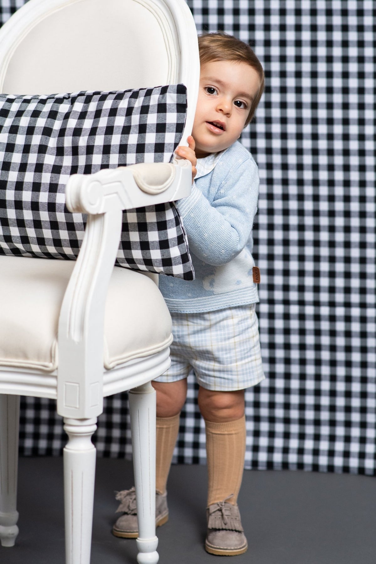 طقم ملابس محبوك للأولاد من ماركة فوك الإسبانية. قميص بولو محبوك بأكمام طويلة من مزيج الصوف والكشمير الناعم والسميك، أزرق سماوي، مزين بنقاط بيضاء ونقشة دب تيدي جذابة، وياقة منقوشة أنيقة وفتحة في المنتصف، مع شورت قطني منسوج بلون أزرق سماوي وبيج متناسق.