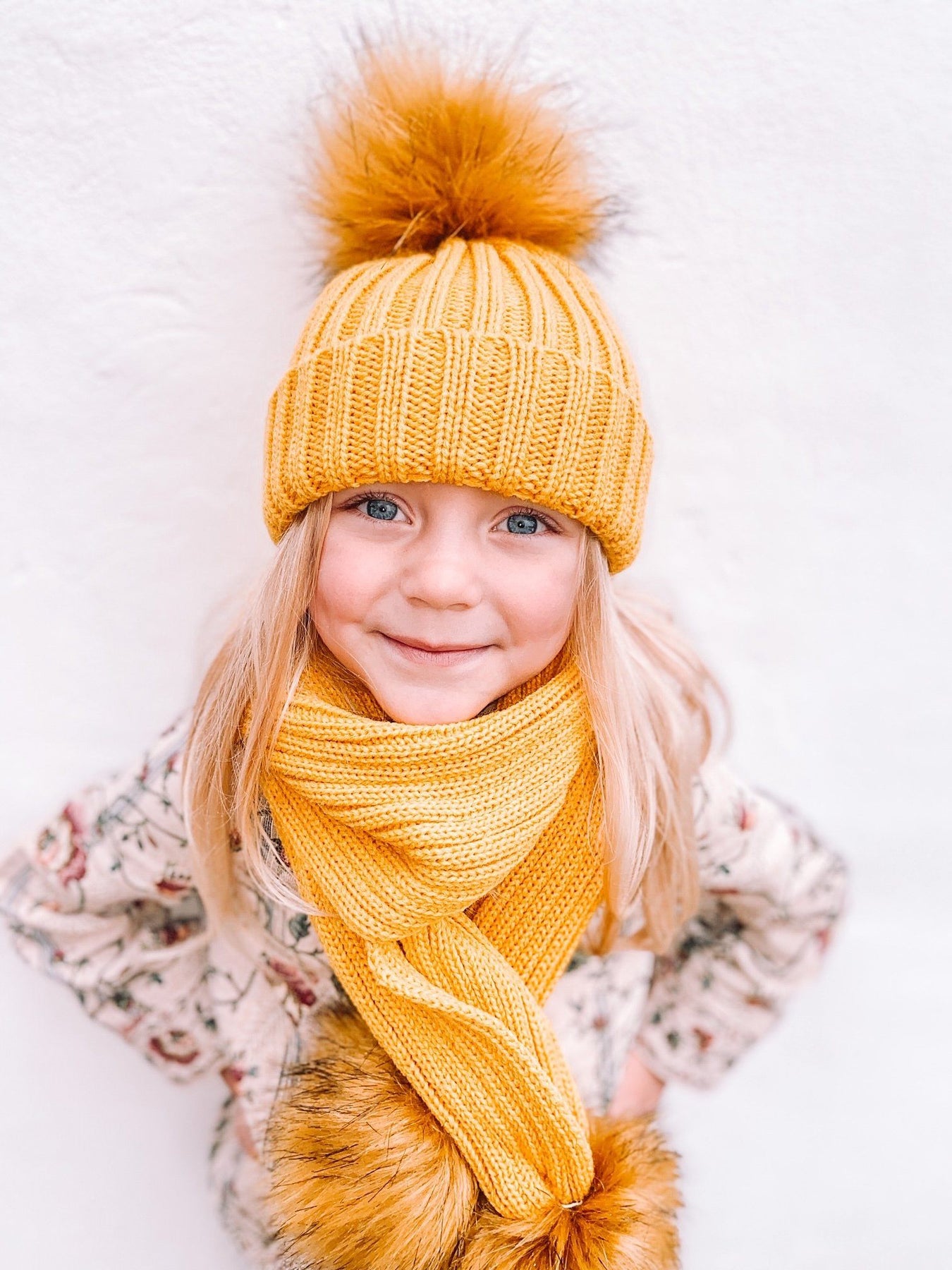 حافظي على مظهر أنيق وشعور دافئ لطفلك مع هذه القبعة المحبوكة ذات الضلع السميك والمغطاة بكرة بوم من الفرو الصناعي كبيرة الحجم وناعمة للغاية.