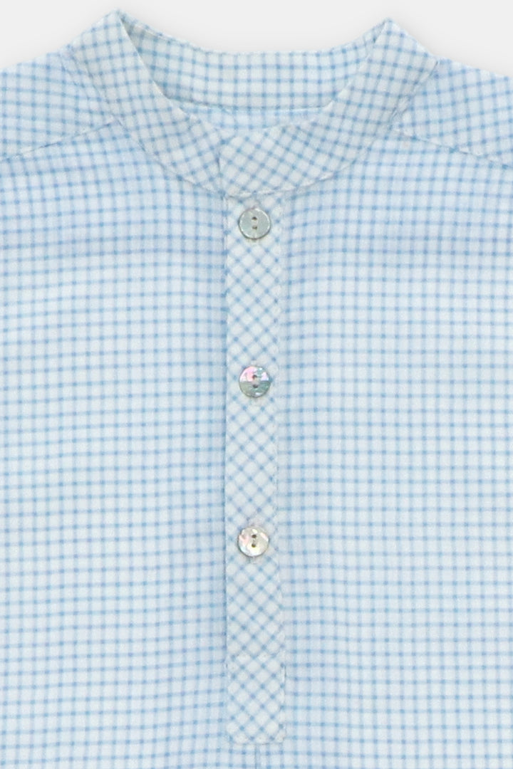 طقم ملابس أنيق للأولاد من مارتن أراندا . قميص خفيف الوزن بأكمام طويلة ومربعات زرقاء داكنة، مع شورت أبيض منعش مع علامة تجارية جلدية بنية أنيقة على الظهر.