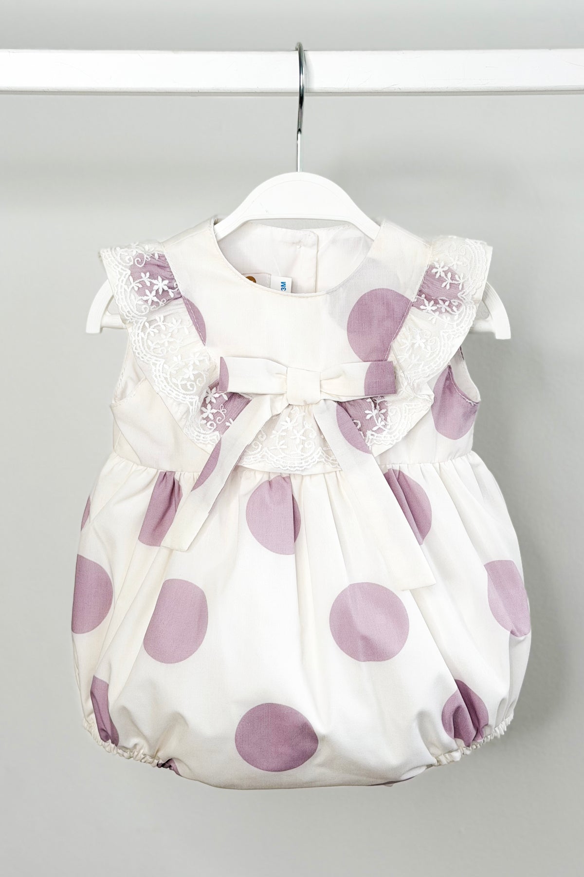 If you love those beautifully delicate pieces that feel a little bit special for your baby girl, this charming Puro Mimo romper is sure to capture your heart. Soft white cotton is scattered with pretty lilac polka dots, creating a timeless look that feels both sweet and playful. A gentle frill sweeps across the chest, finished with delicate lace trim and topped with a lovely bow that adds an extra touch of elegance. Made from lightweight, breathable cotton and fully lined for comfort, it keeps your little one cool while the softly elasticated legs create that classic baby silhouette. Pearlised button fastenings at the back and crutch make dressing and nappy changes quick and easy – thoughtful details you’ll appreciate every day.