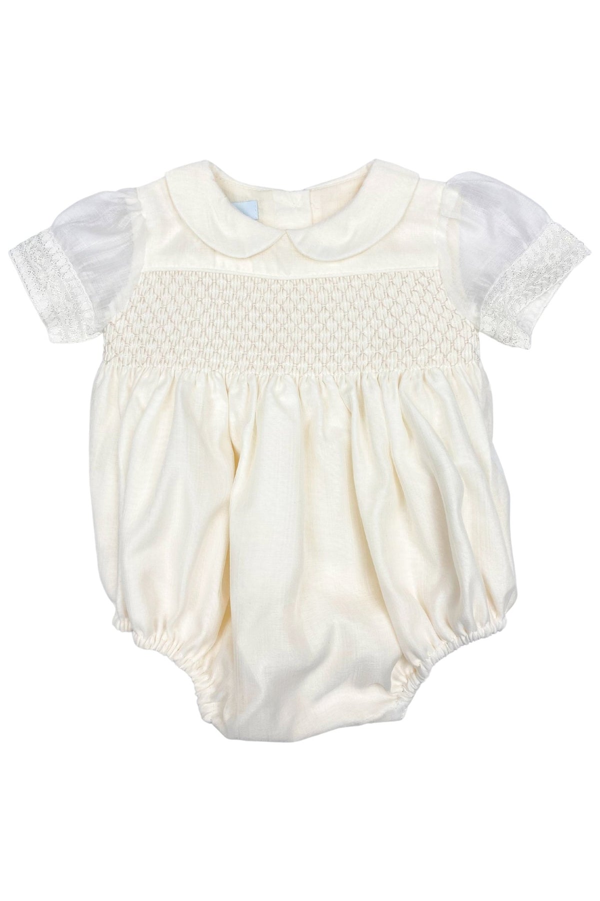 رومبر كلاسيكي مطرز من المصممة الإسبانية أرتيسانيا غرانلي . نقدم لكم رومبر "أسبن" - مزيج مثالي من النعومة والأناقة والجاذبية! يتميز هذا الرومبر المناسب للجنسين بأكمام منفوخة رقيقة وشفافة مزينة بدانتيل أنيق، ومزين بتطريز يدوي رائع على الصدر. مثالي لأي مناسبة، سواءً كانت حفل تعميد رسمي أو يوم ممتع في الحديقة.