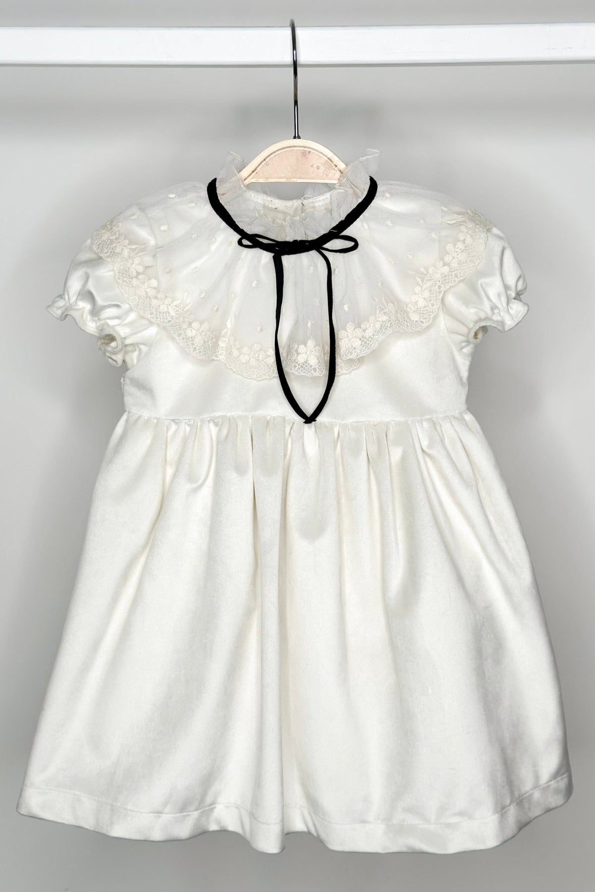 فستان مخملي للبنات من ماركة فوفيت البرتغالية x بي شيك . ناعم للغاية (كأنه أنعم مخمل ستلمسينه على الإطلاق) من المخمل العاجي، مع ياقة دانتيل عاجية زهرية خلابة، مزين بفيونكة مخملية سوداء عند الرقبة وحزام عاجي يربط بفيونكة كبيرة جدًا من الخلف.