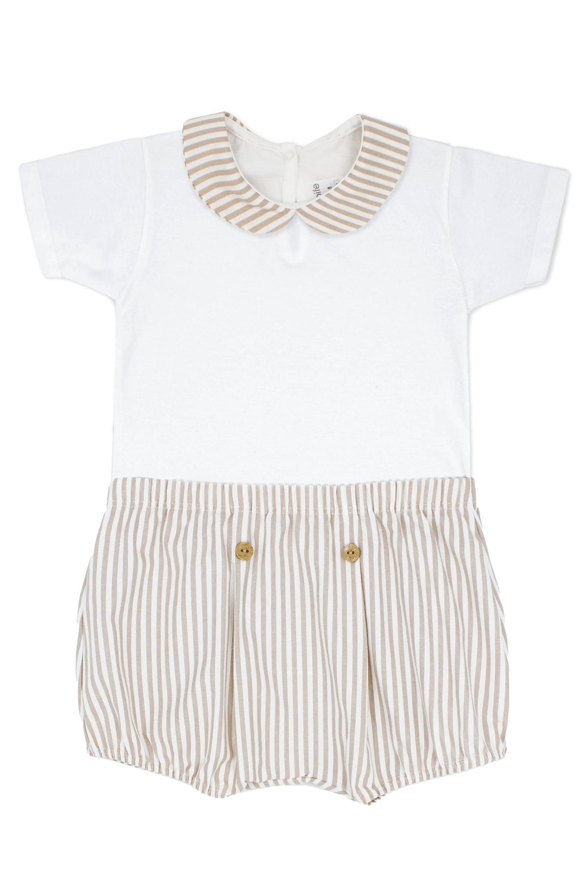 طقم ملابس للأولاد من العلامة التجارية الإسبانية رابيف ، مجموعة ربيع وصيف ٢٠٢٤. بدلة جسم خفيفة الوزن بلون عاجي بأكمام قصيرة وياقة، مع بنطال مخطط باللونين البيج والأبيض. مثالي للمناسبات الخاصة أو أيام التنزه المشمسة.