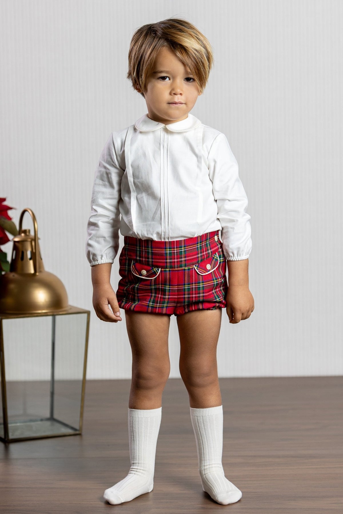 زيّ تقليديّ إسبانيّ للصبيان من ماركة "أبويلا تاتا" الإسبانية. قميص قطنيّ خفيف الوزن بأكمام طويلة وياقة عاجيّة، مُنسّق مع بنطال منقوش أحمر وأصفر وأخضر فاتح بجيوب أمامية.