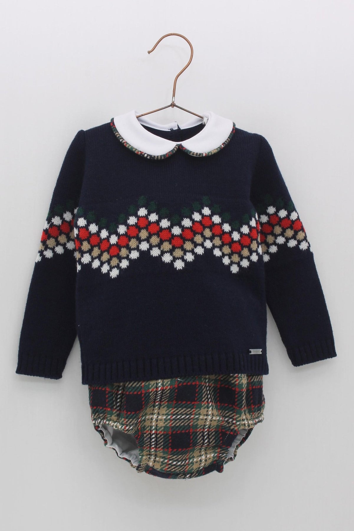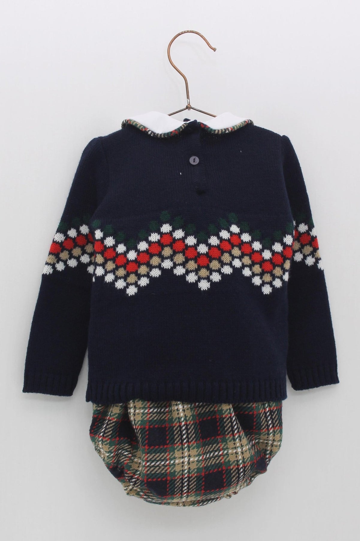 طقم ملابس محبوك للأولاد من ماركة Foque الإسبانية. يتكون من بلوزة محبوكة من مزيج الصوف باللون الأزرق الداكن بأكمام طويلة وياقة بيتر بان من القطن الأبيض ونقشة متعرجة منقطّة حول الصدر، مع بنطلون من قماش التارتان بألوان الجمل والأخضر والأحمر.