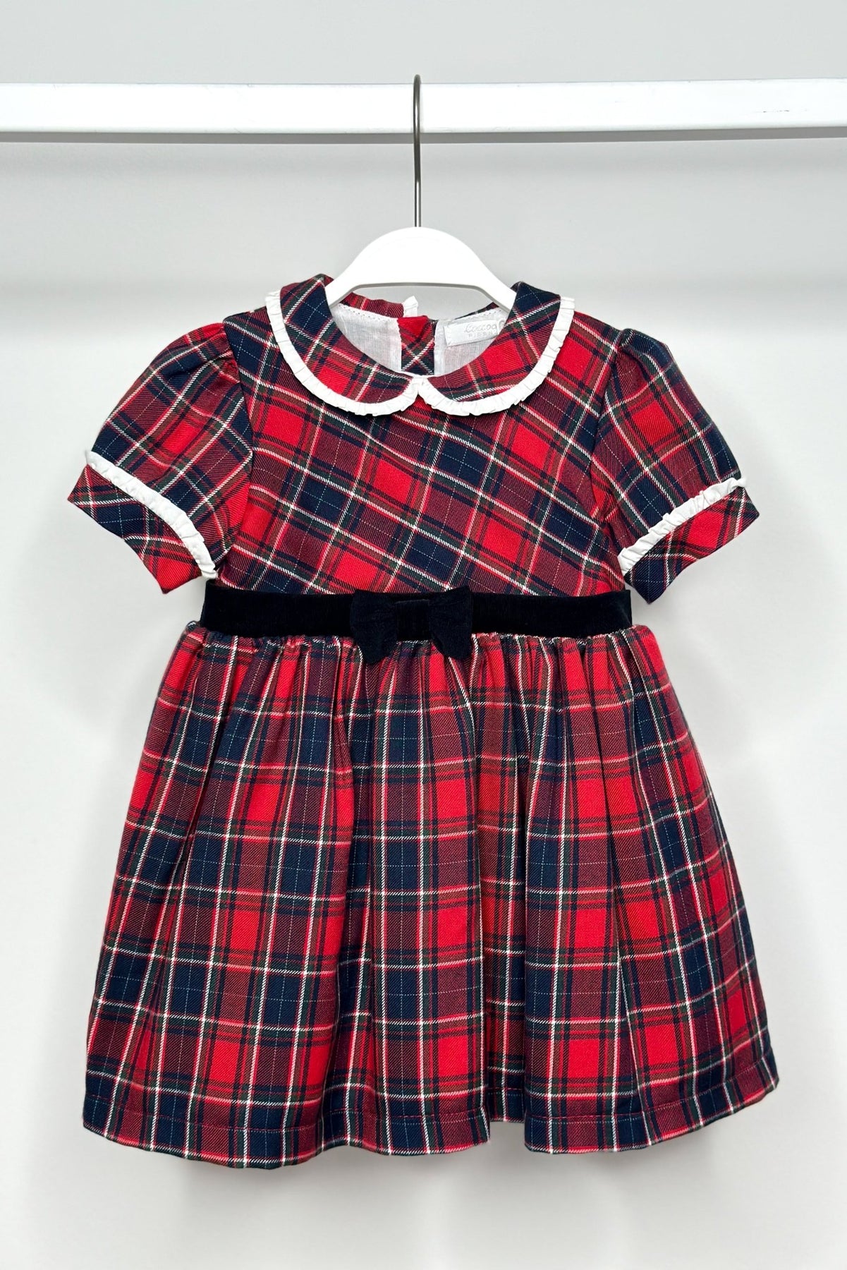 فستان بناتي أحمر منقوش من ماركة كوكود الإيطالية. فستان خفيف منقوش بألوان الأحمر والأزرق الداكن والأخضر، بأكمام قصيرة، مع طيات بيضاء عند الياقة والأكمام، وحزام أزرق داكن حول الخصر، يعلوه فيونكة.