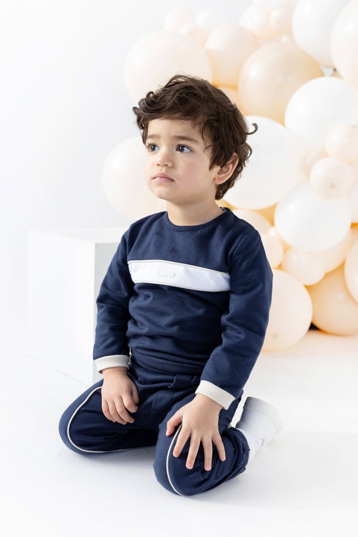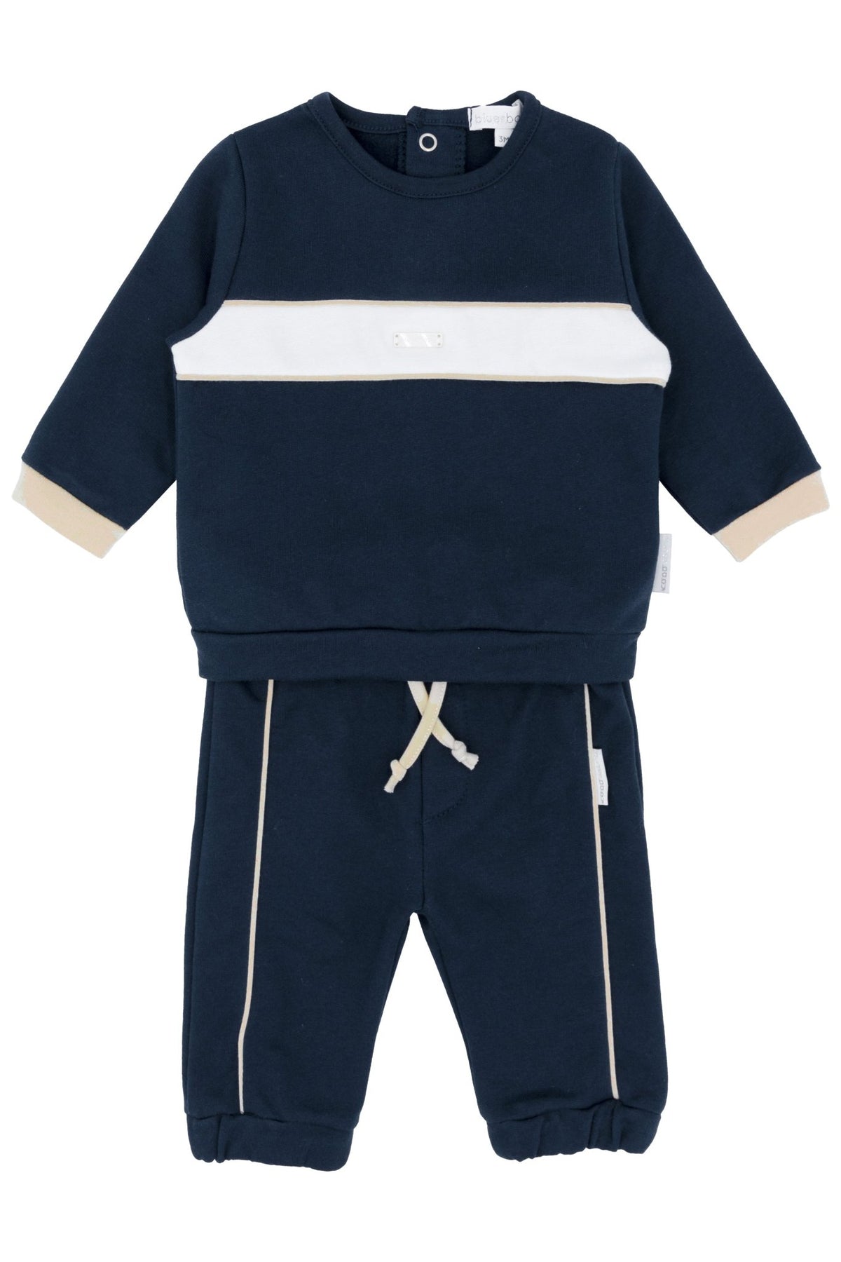 بدلة رياضية للأولاد من العلامة التجارية البريطانية بلوز بيبي . سويت شيرت ناعم وسميك من قطن الجيرسيه البحري بأكمام طويلة، مع حواف بيج ولوحة بيضاء على الصدر، يمكن تنسيقه مع بنطال قطني من نفس اللون مع حواف بحرية على طول الساقين ورباط خصر صناعي.