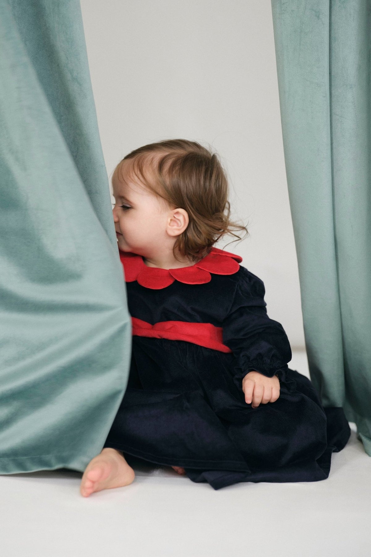فستان بناتي من ماركة ديوليندا البرتغالية. فستان مخملي ناعم للغاية بأكمام طويلة، بياقة حمراء متباينة، مزين بحزام أحمر يربطه فيونكة مخملية حمراء كبيرة من الخلف.
