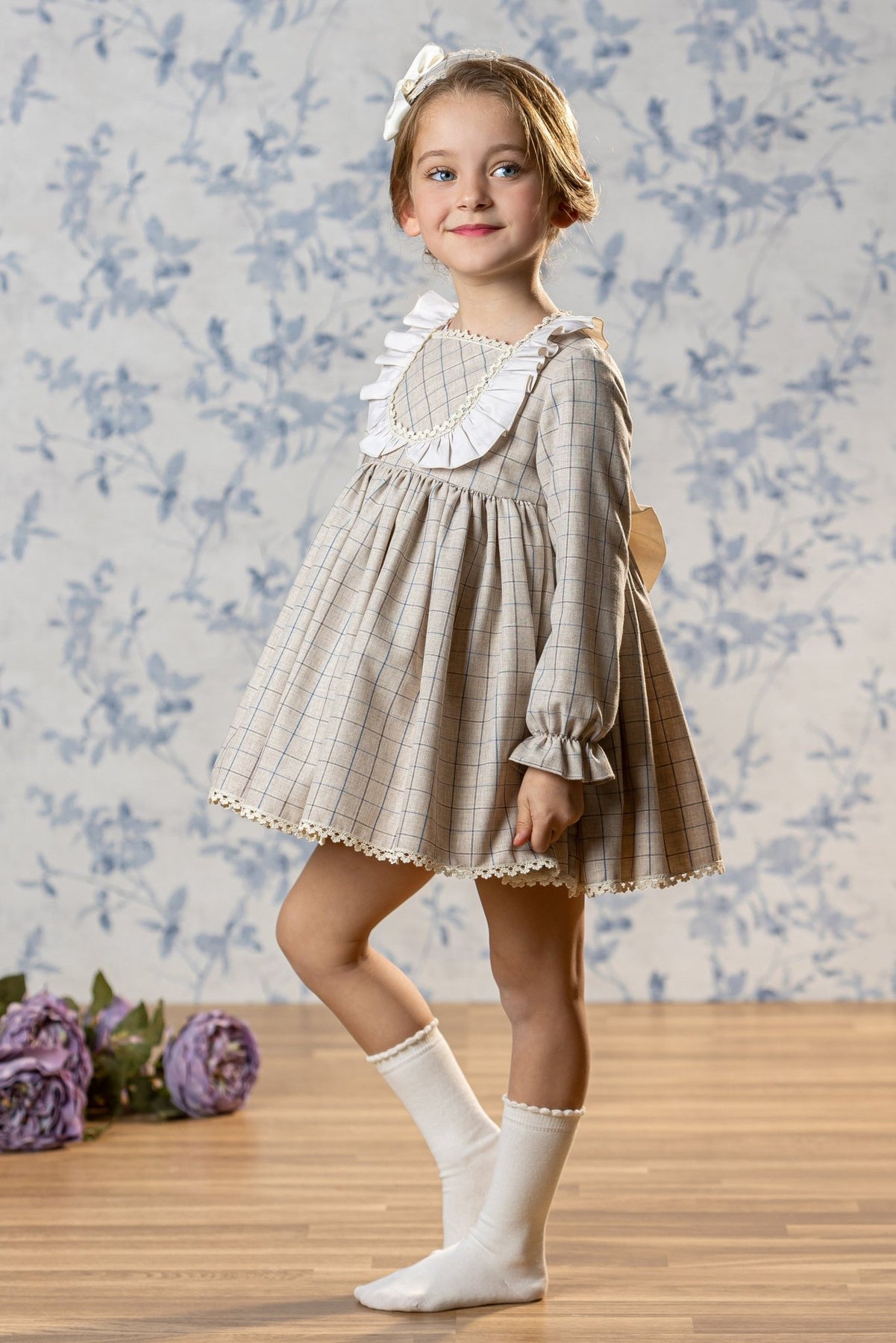فستان بناتي تقليدي على الطراز الإسباني من ماركة أبويلا تاتا الإسبانية. فستان بأكمام طويلة، مزين بنقشة مربعات باللونين البيج والأزرق الداكن، مع حافة دانتيل كروشيه كريمي عند الرقبة والحاشية، وكشكشة أنثوية حول الصدر والرقبة. مزين بفيونكة كبيرة بلون البسكويت من الخلف.