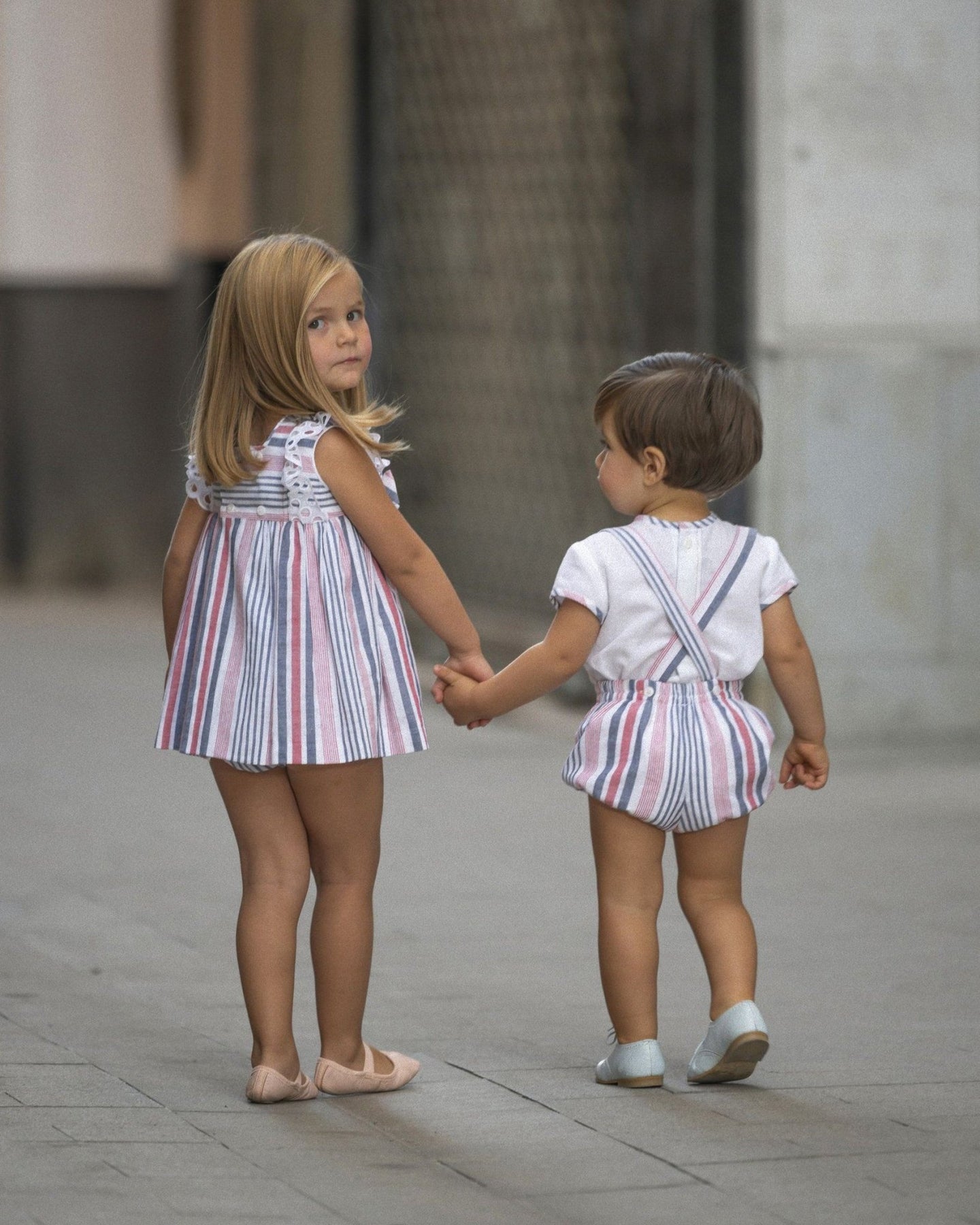 طقم ملابس بطابع بحري من مجموعة ربيع/صيف ٢٠٢١ للمصممة الإسبانية كوكوت . قميص أبيض من مزيج الكتان بأكمام قصيرة مع حواف مخططة باللونين الأزرق الداكن والأحمر على الرقبة والأكمام، وبنطال من مزيج الكتان بخطوط متناسقة باللونين الأزرق الداكن والأحمر والأبيض مع حمالات. تتوفر تصاميم متناسقة من نفس المجموعة.