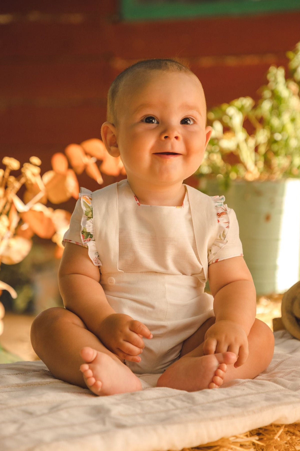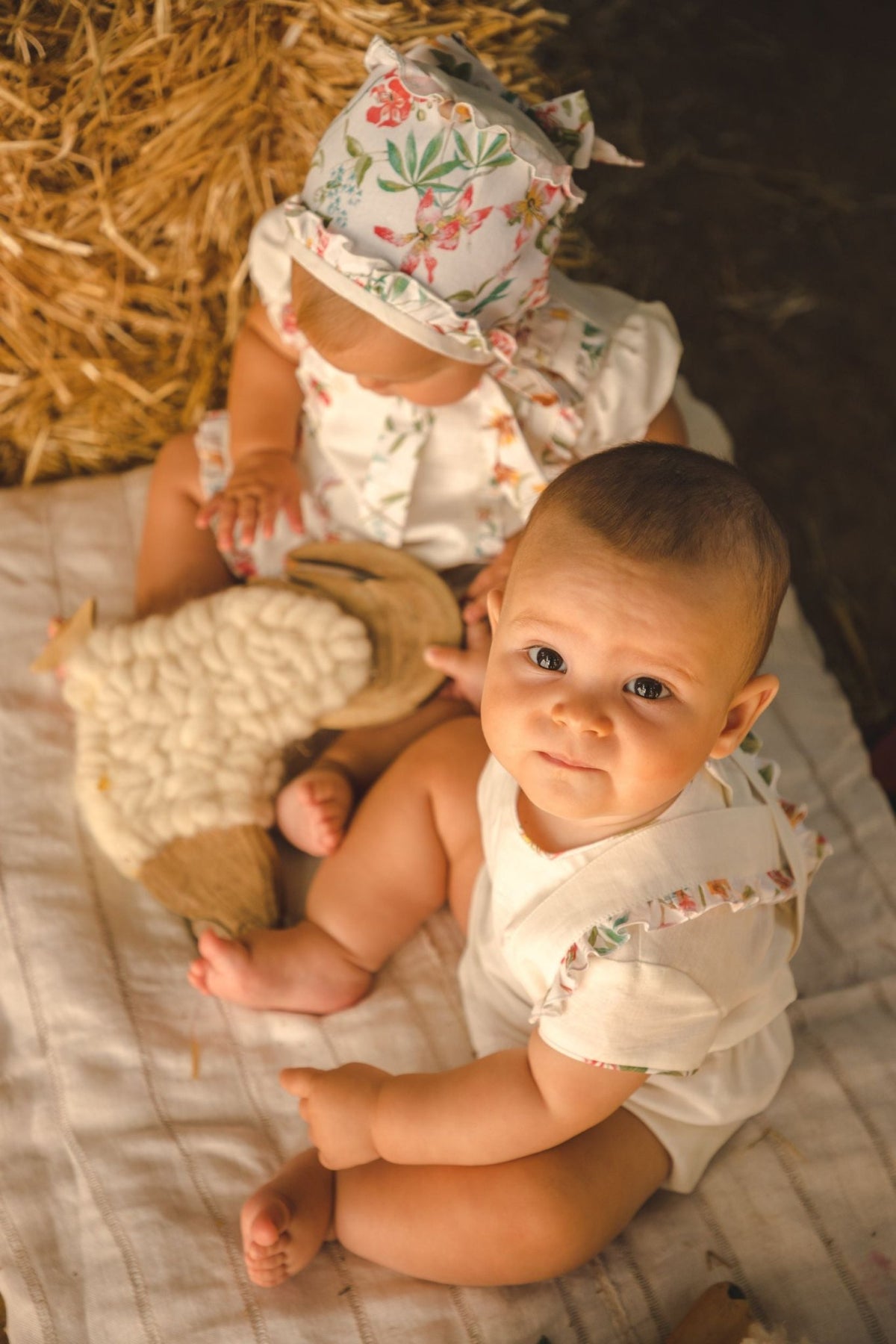 طقم ملابس أطفال للجنسين من ماركة كوكوتي الإسبانية. بلوزة بيضاء بأكمام قصيرة مزينة بنقشة زهور متعددة الألوان على الرقبة والأكمام، وبنطال رياضي متناسق أسفلها مزين بكشكشة زهور على الحمالات، مصنوع من مزيج كتان خفيف الوزن وجيد التهوية. مزين بشريط جلدي يحمل العلامة التجارية على الساق.