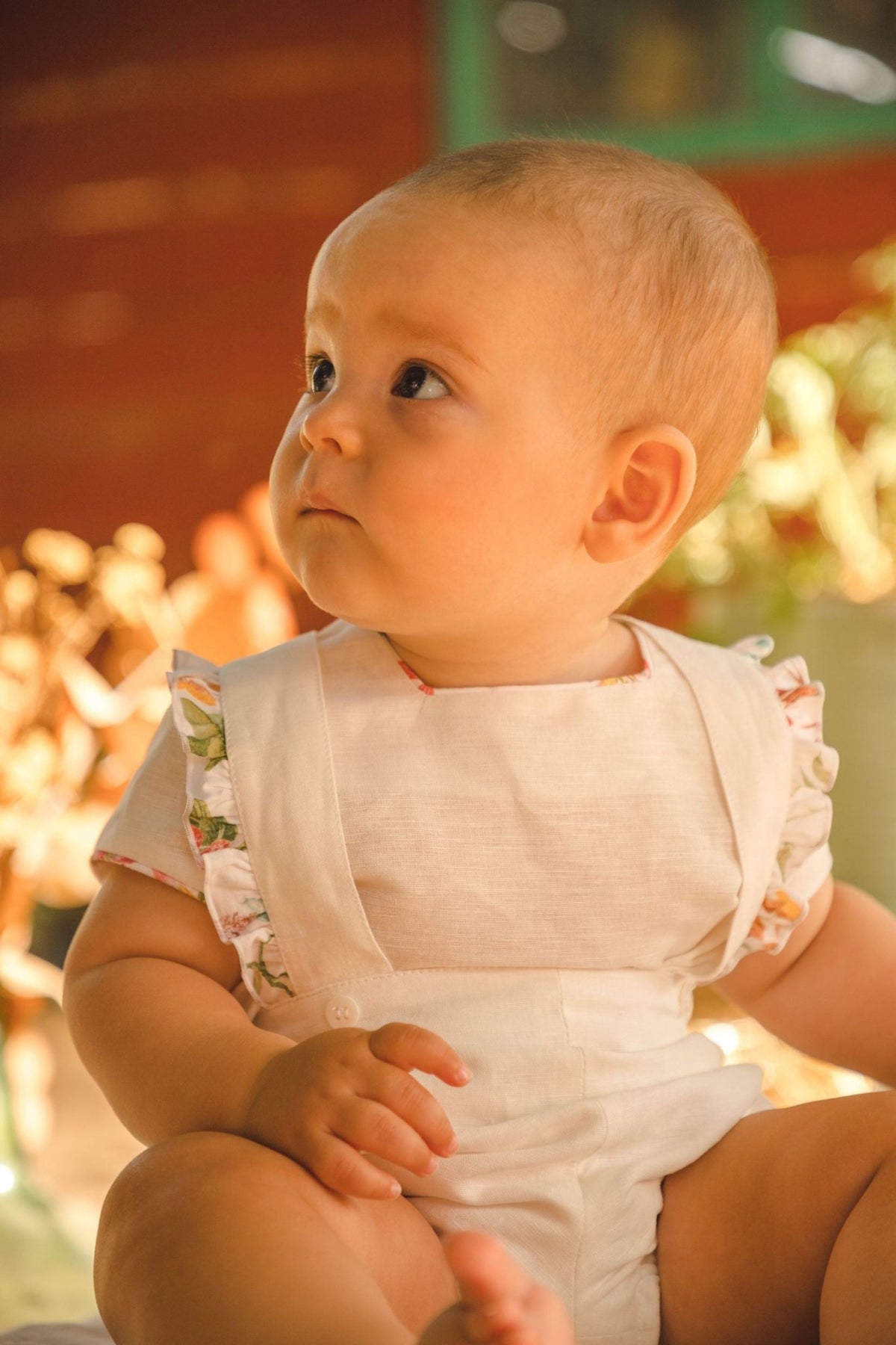 أزرار من عرق اللؤلؤ تُغلق من الخلف حتى الجزء العلوي من حمالة الصدر. خصر مطاطي وأساور للساقين لراحة طفلك. بنطال "جام" مبطن.
