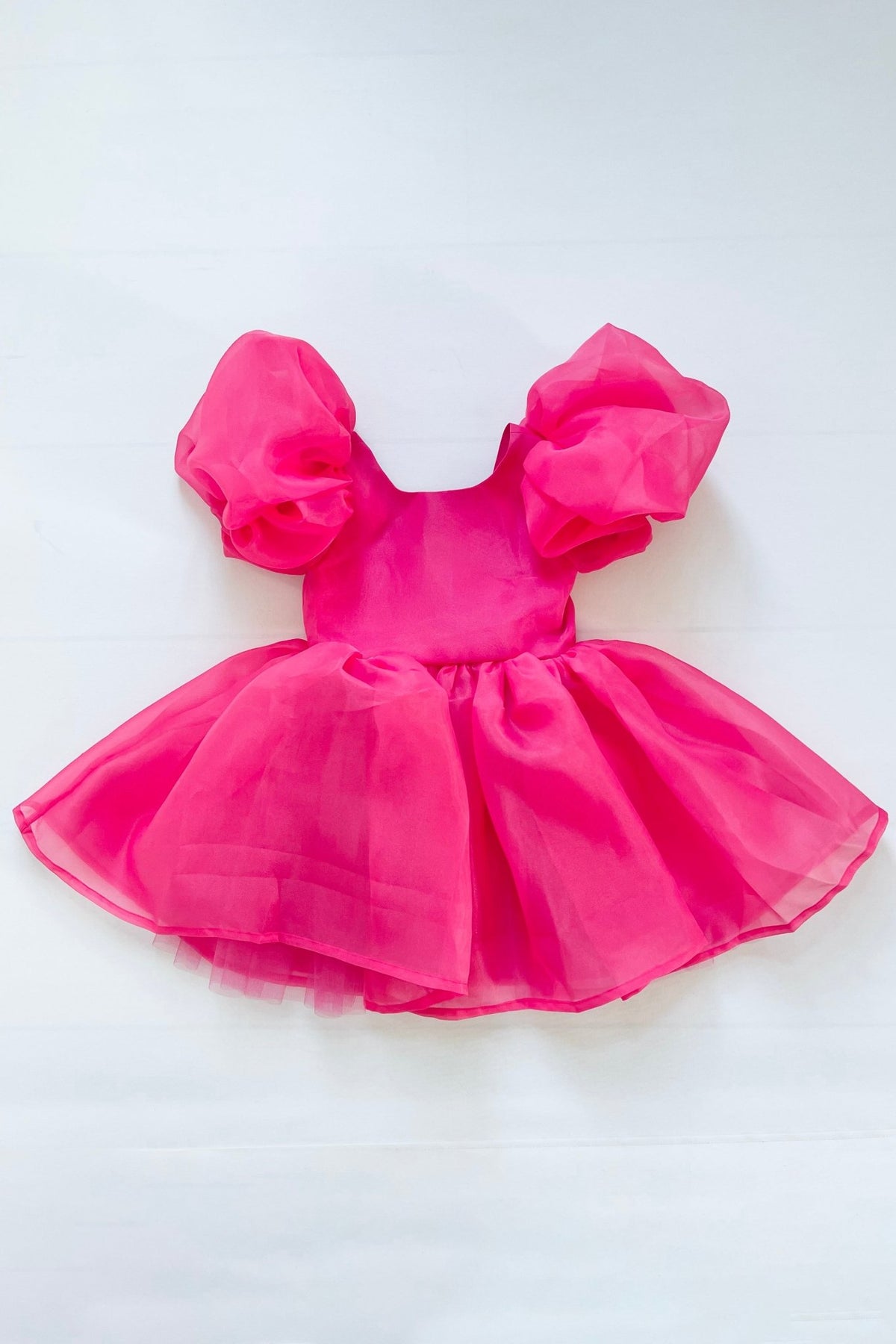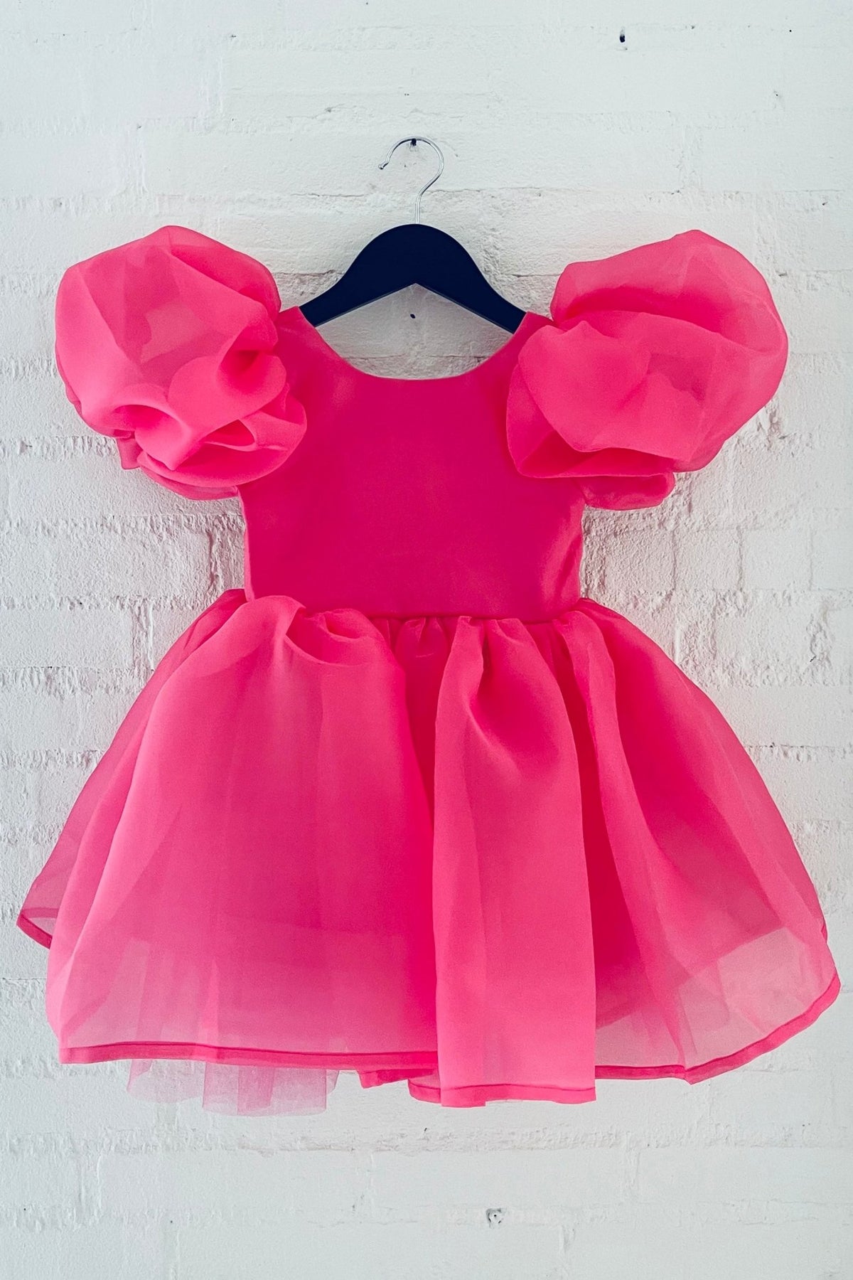 فستان بناتي بأكمام منفوخة من ماركة DOLLY الهولندية من Le Petit Tom . هذا الفستان الوردي الفاقع الجميل بأكمام منفوخة مصنوع من قماش ساتان أورجانزا وردي فاقع ناعم ولامع، يحافظ على شكله المثالي - مثالي لدميتك الصغيرة. يتميز بظهر عميق على شكل حرف V، وتنورة من طبقات التول الرقيقة - مثالية للرقص.