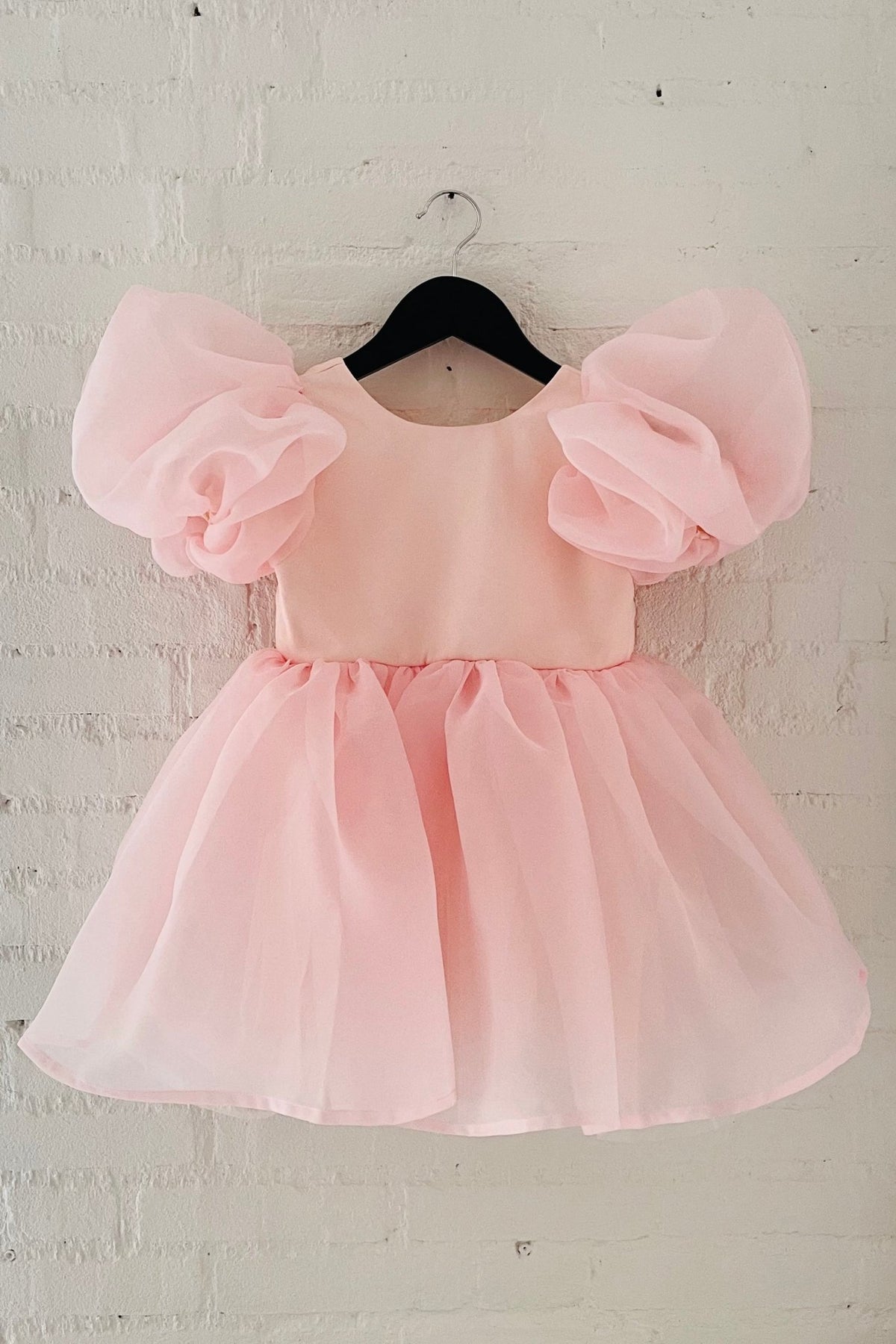 فستان وردي من الساتان والأورجانزا بأكمام منتفخة