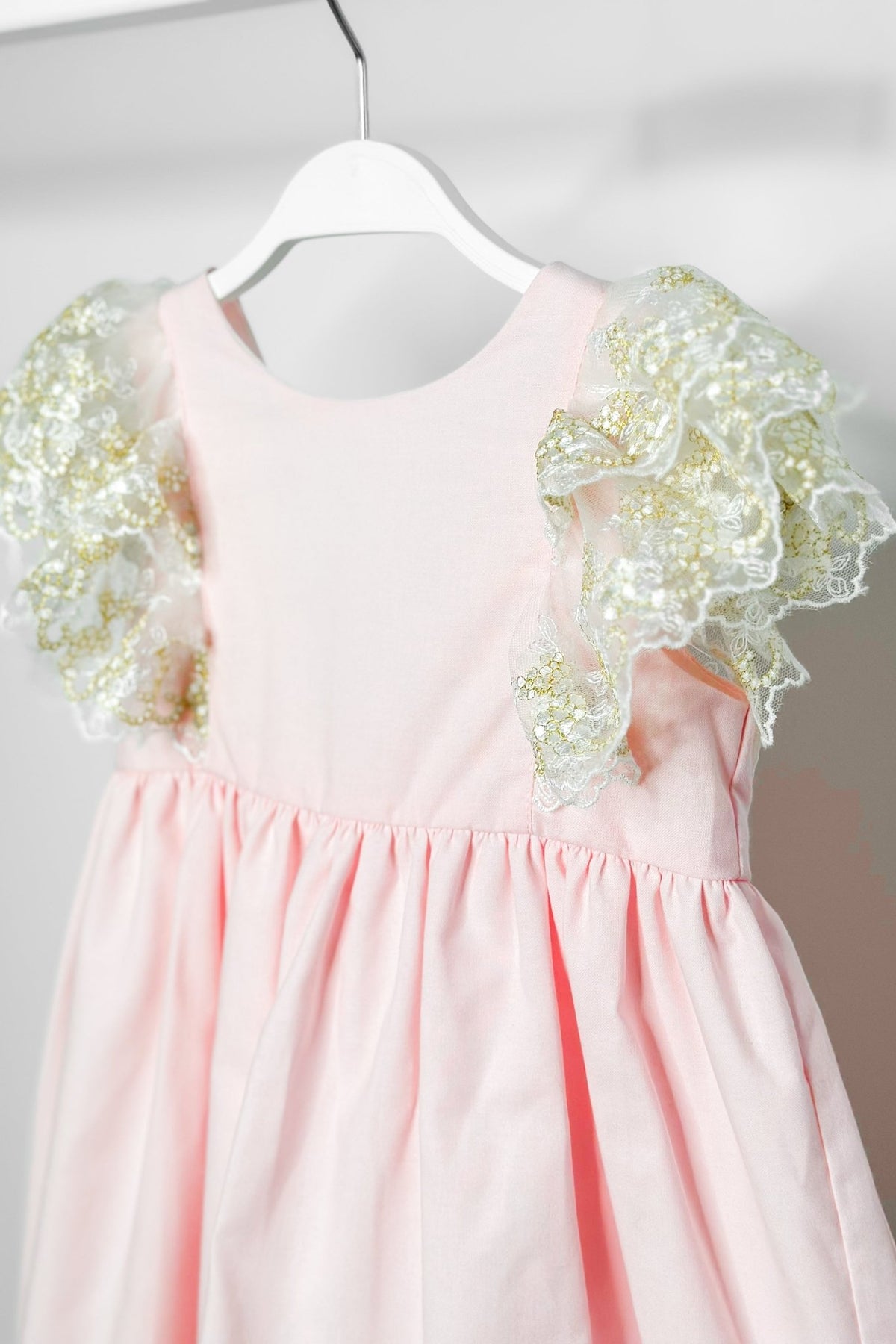 فستان وردي لطفلة من ماركة فوف إيتس الهولندية. خفيف ومنعش، هذا الفستان الوردي القطني المنسوج مثالي لأي مناسبة خاصة. يتميز بأكمام من الدانتيل الذهبي متعدد الطبقات وعقدة كبيرة أنيقة على الظهر المنخفض، مما يجعله مثاليًا على الشاطئ المشمس أو في الكنيسة.