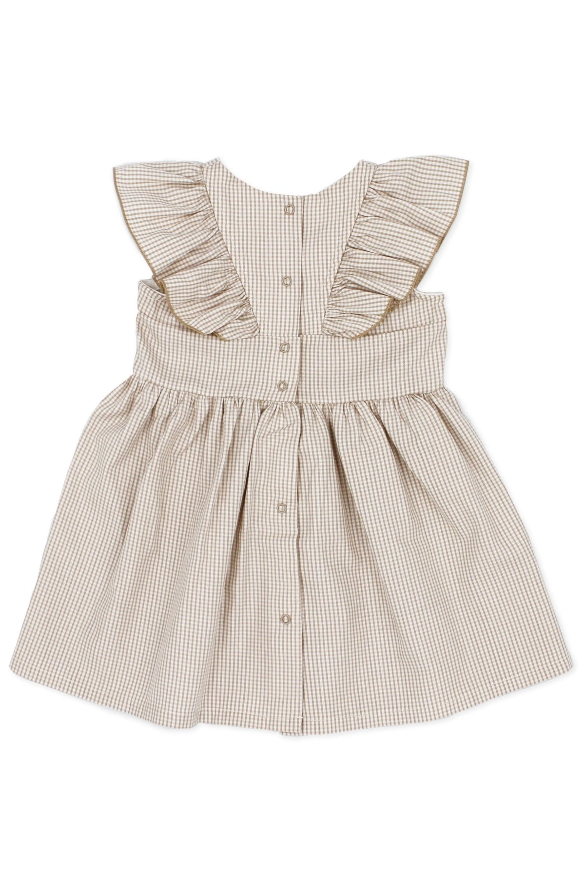 فستان بناتي من ماركة رابيف الإسبانية. فستان قطني خفيف الوزن للغاية بلون بيج منقوش، مع كشكشة أنثوية واسعة على الكتفين. مثالي للمناسبات الخاصة أو أيام التنزه المشمسة.