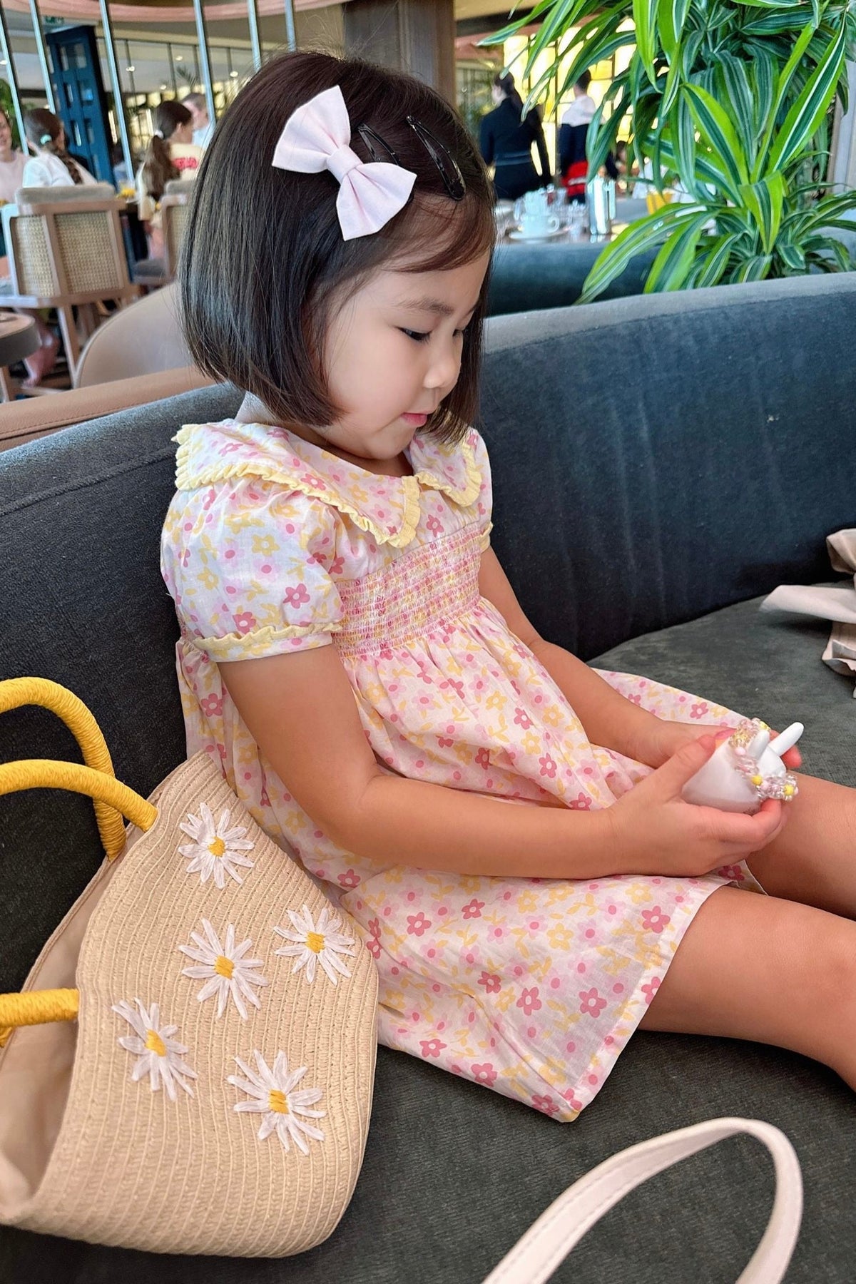 فستان زهريّ لطفلة من ماركة ديوليندا البرتغالية. فستان زهريّ ناعم وخفيف الوزن بلون الليمون والوردي، مع تطريزات أنيقة حول الصدر وكشكشة ليمونية على الياقة والأكمام.