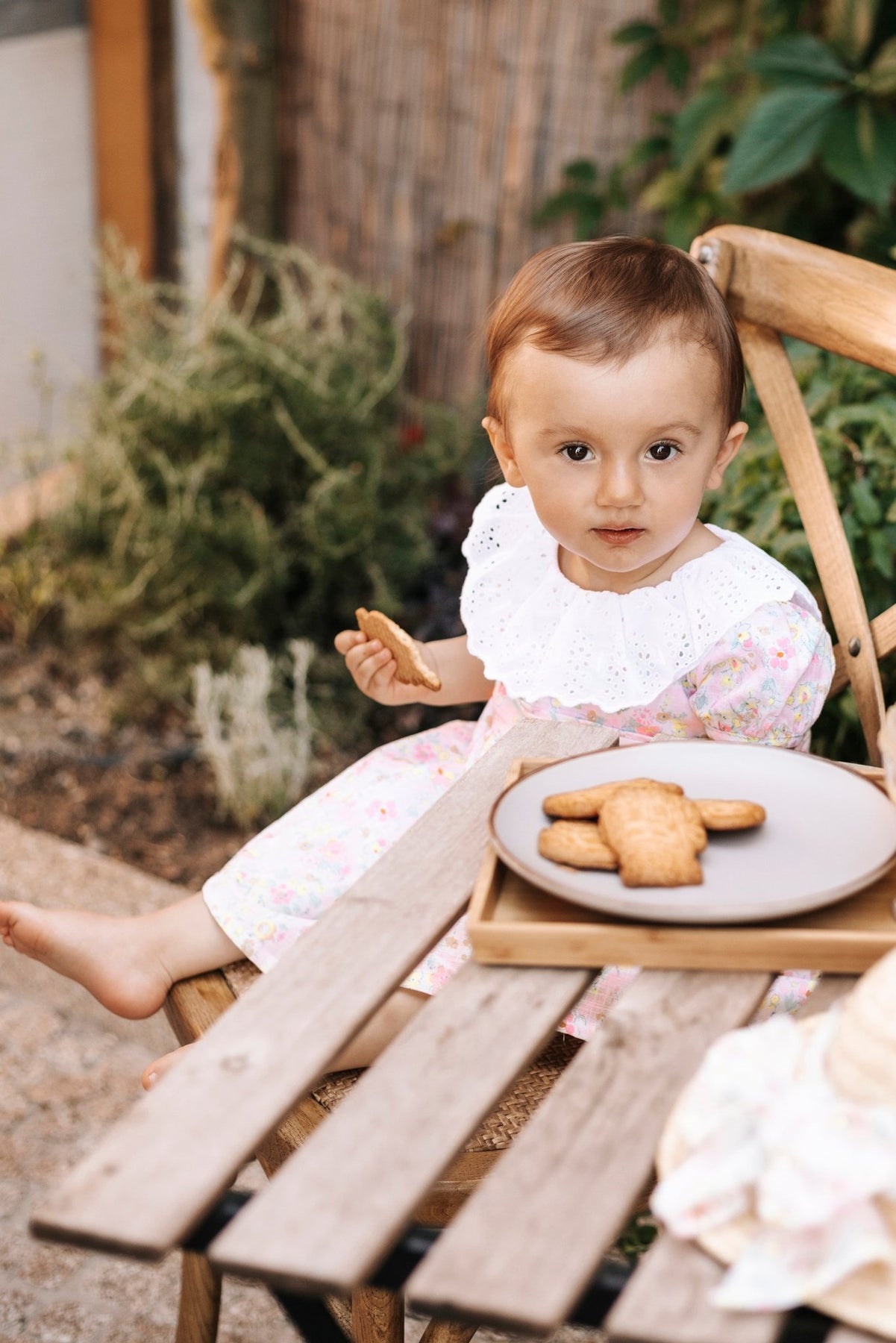 فستان زهريّ لطفلة من ماركة ديوليندا البرتغالية. فستان زهريّ ناعم وخفيف الوزن باللونين الورديّ والليمونيّ مع قوس كبير في الخلف وياقة كشكشة مطرزة باللون الأبيض الجميل.