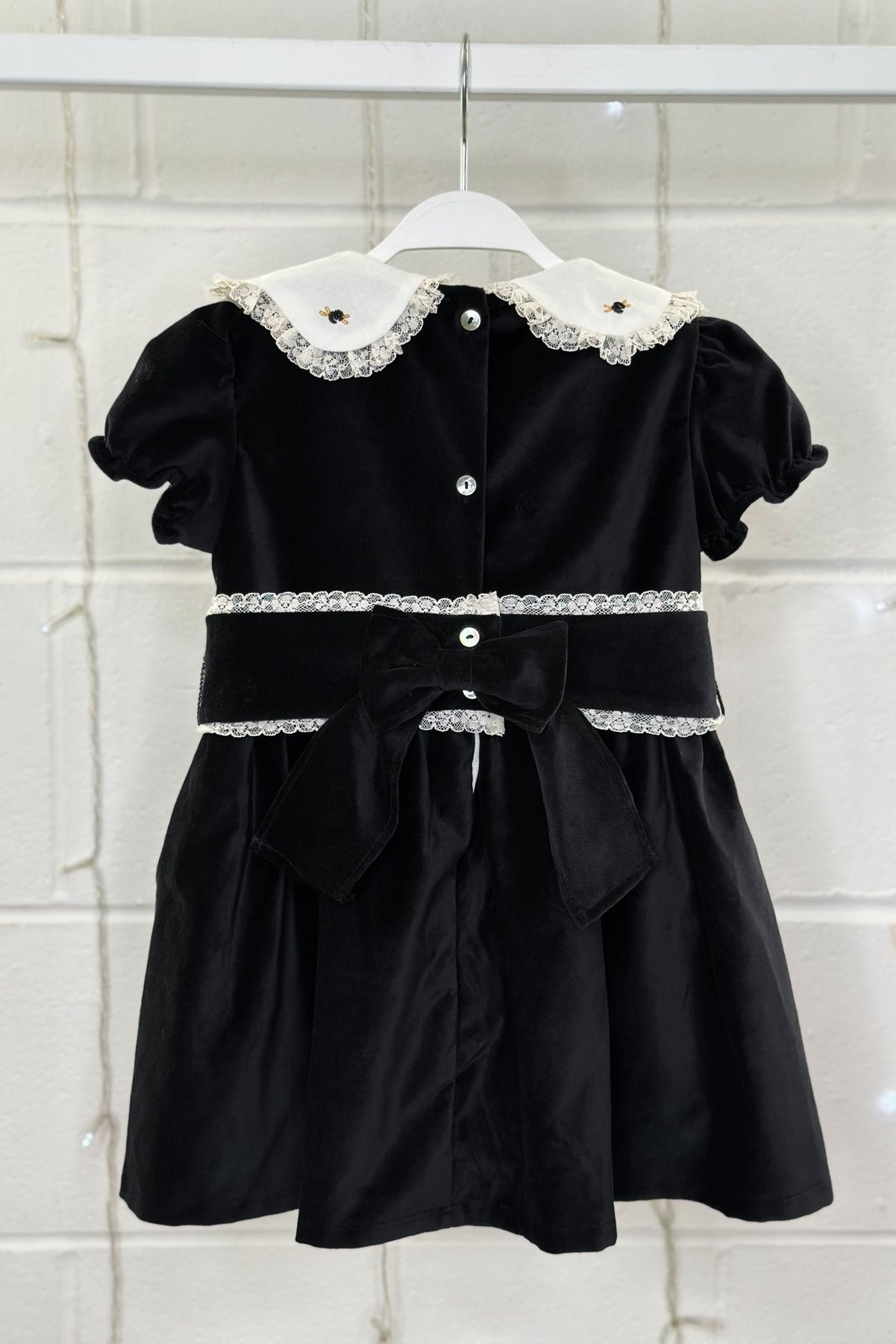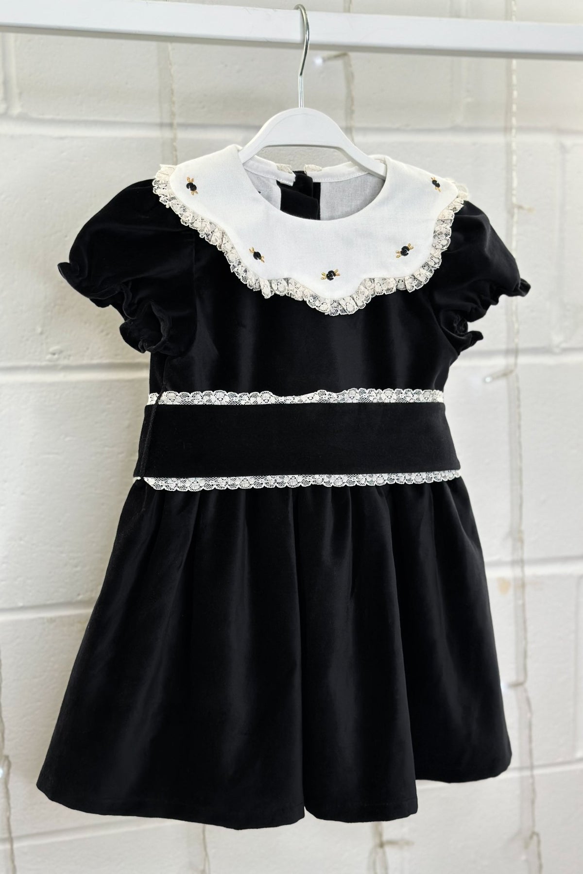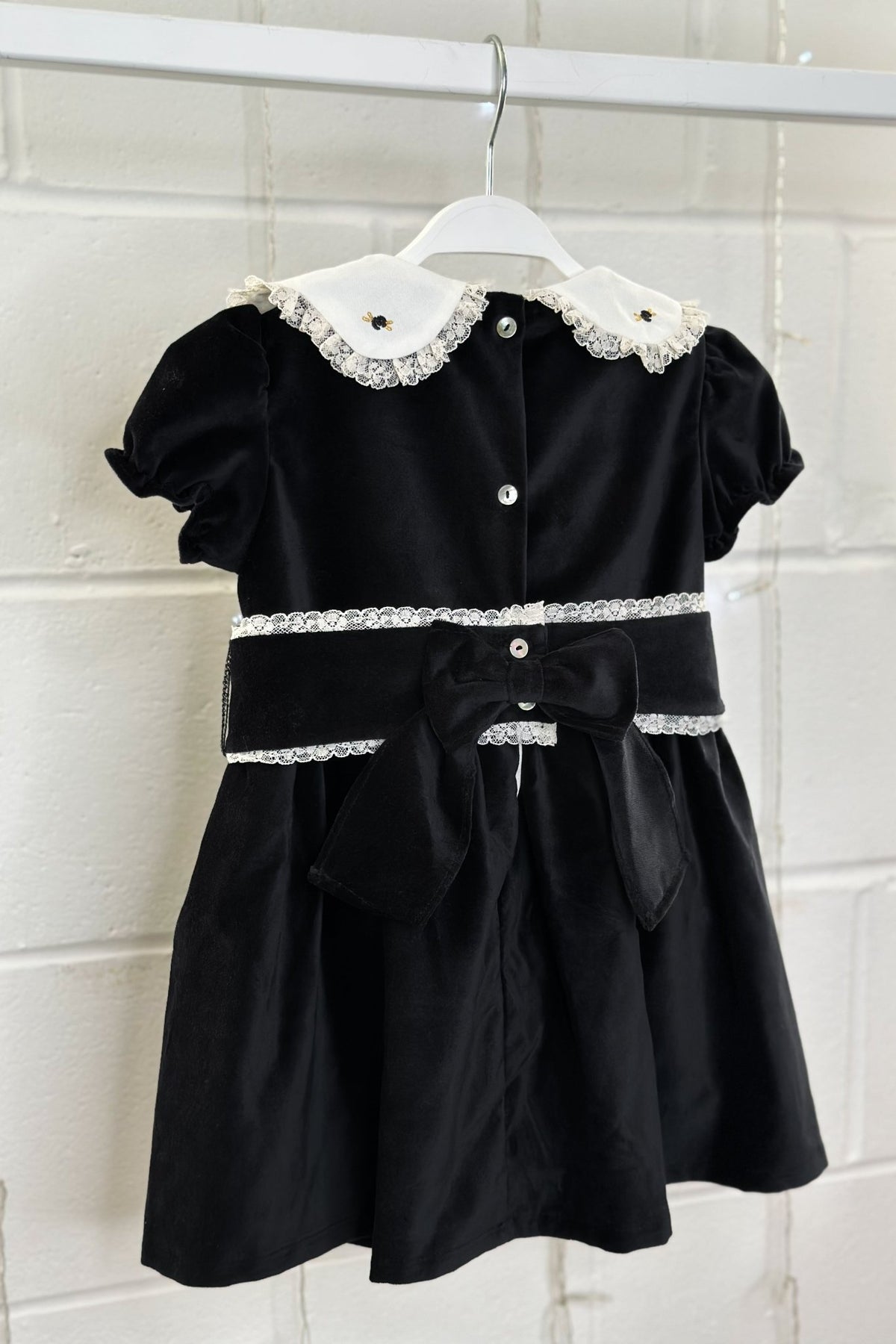 فستان مخملي بناتي من ماركة فوفيت الهولندية. فستان مخملي أسود ناعم للغاية بأكمام قصيرة، بياقة بيضاء أنيقة مزينة بورود مطرزة يدويًا وحافة دانتيل أنيقة، وحزام مزين بالدانتيل يعلوه فيونكة مخملية وردية كبيرة من الخلف.