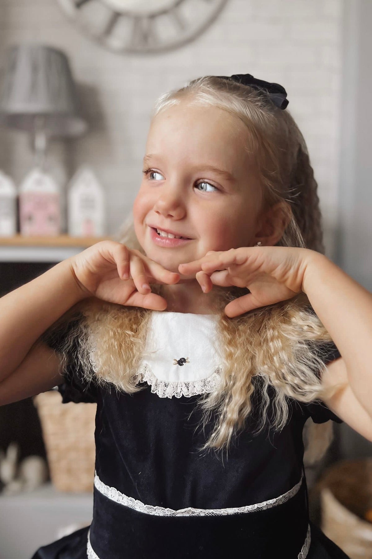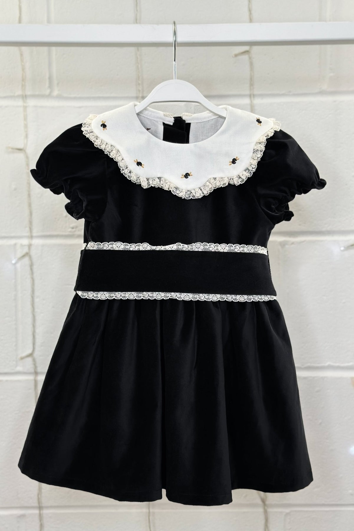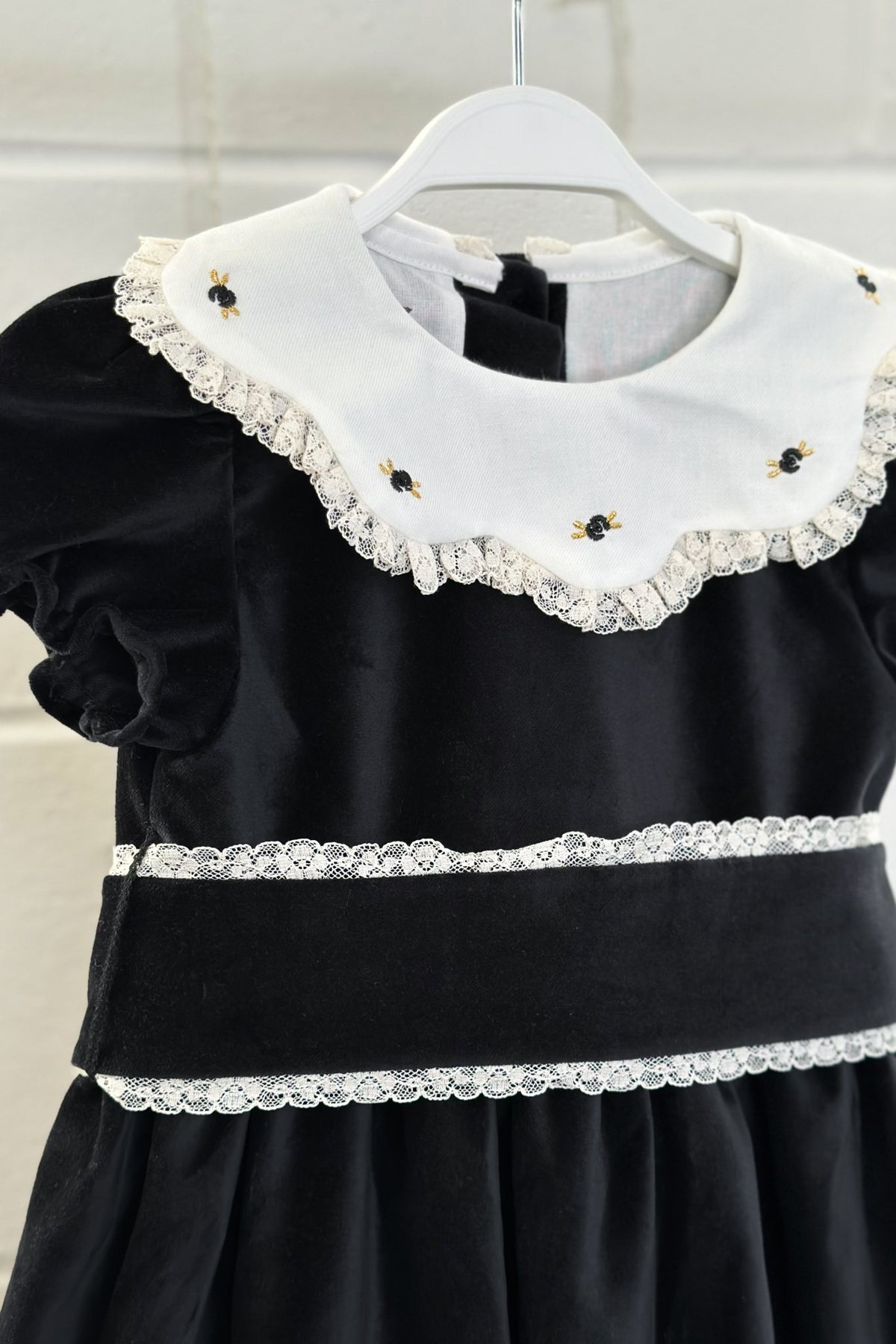 فستان مخملي بناتي من ماركة فوفيت الهولندية. فستان مخملي أسود ناعم للغاية بأكمام قصيرة، بياقة بيضاء أنيقة مزينة بورود مطرزة يدويًا وحافة دانتيل أنيقة، وحزام مزين بالدانتيل يعلوه فيونكة مخملية وردية كبيرة من الخلف.