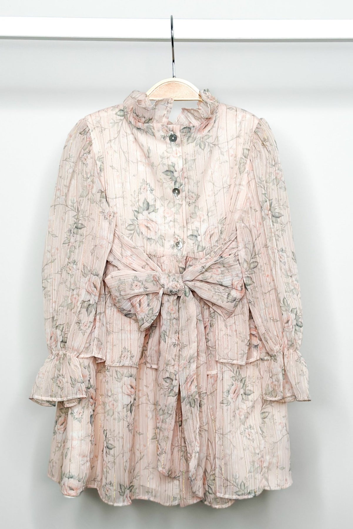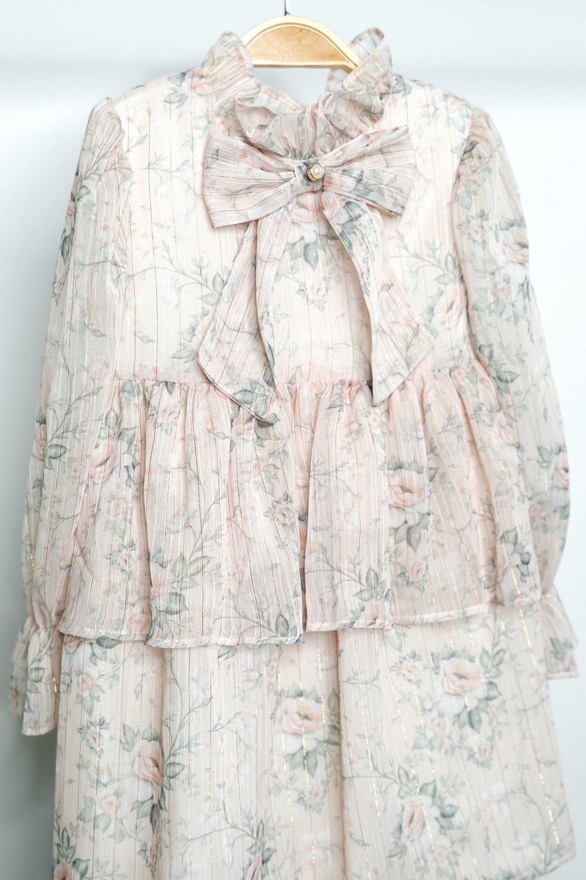 فستان بناتي مزهر من ماركة فوفيت الهولندية. فستان زهري خفيف الوزن بأكمام طويلة، بنقشة زهور عتيقة، مزين بخطوط لوريكس ذهبية أنيقة. مزين بكشكشة على الرقبة والأكمام والخصر، وفيونكة على الرقبة تعلوها لؤلؤة صناعية. يُربط الحزام على شكل فيونكة من الخلف.