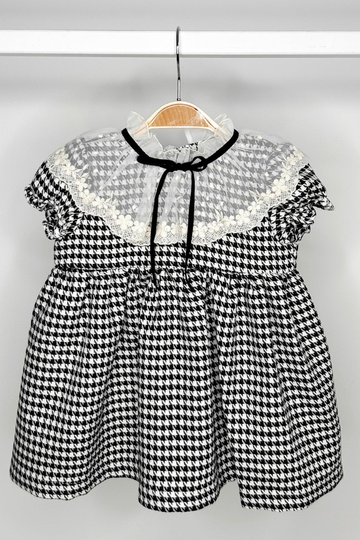 فستان بناتي من العلامة البرتغالية Fofettes x Be Chic . فستان ناعم، متوسط الوزن، بنقشة مربعات سوداء وبيضاء، مع ياقة دانتيل زهرية رائعة بلون العاج، وعقدة مخملية سوداء عند الرقبة.