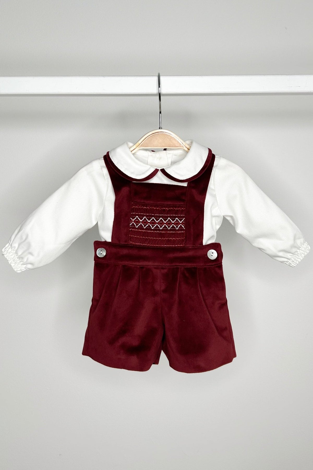 طقم دنغري مخملي للأولاد من العلامة البرتغالية فوفيت × بي شيك . قميص خفيف الوزن عاجي اللون منسوج بأكمام طويلة مع حواف مخملية عنابية عند الياقة، وأسفله دنغري مخملي عنابية ناعم للغاية (كأنه أنعم مخمل ستلمسه على الإطلاق) مع صدرية مطرزة يدويًا.