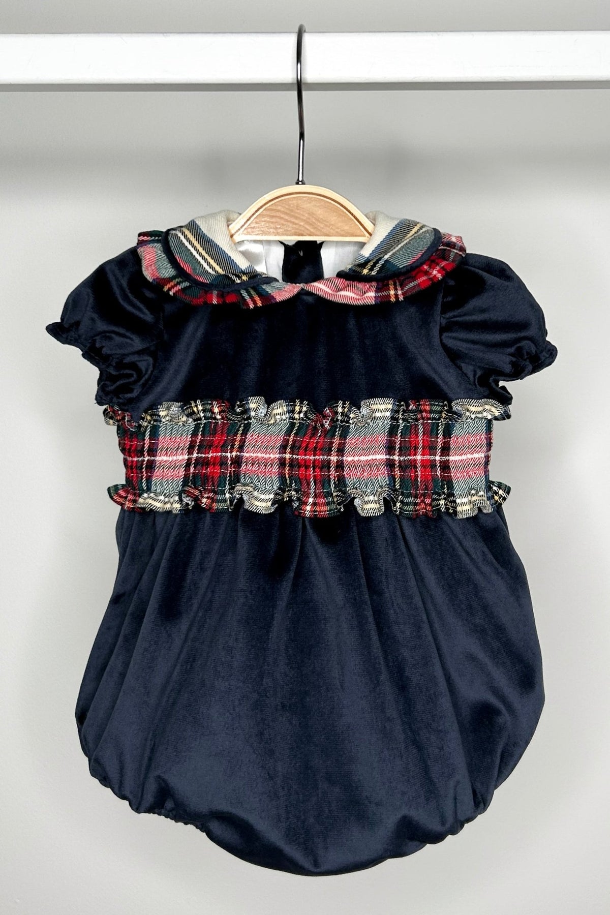رومبير مخملي لطفلة من ماركة فوفيتس البرتغالية × بي شيك . ناعم للغاية (كأنه أنعم مخمل ستلمسينه على الإطلاق) بلون كحلي، مع ياقة منقوشة باللونين الأحمر والأخضر الزجاجي، وحزام مخيط بحافة مكشكشة.