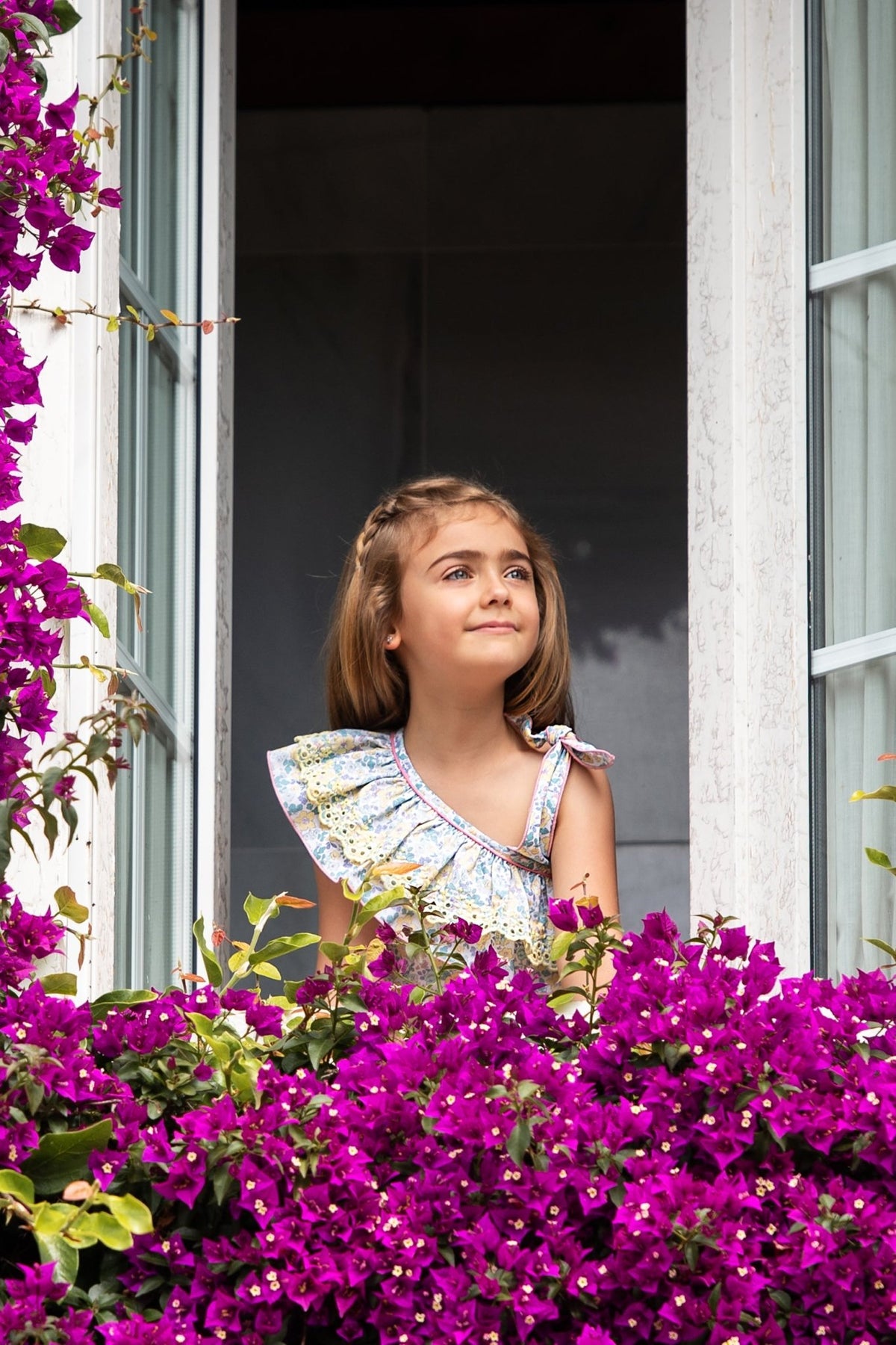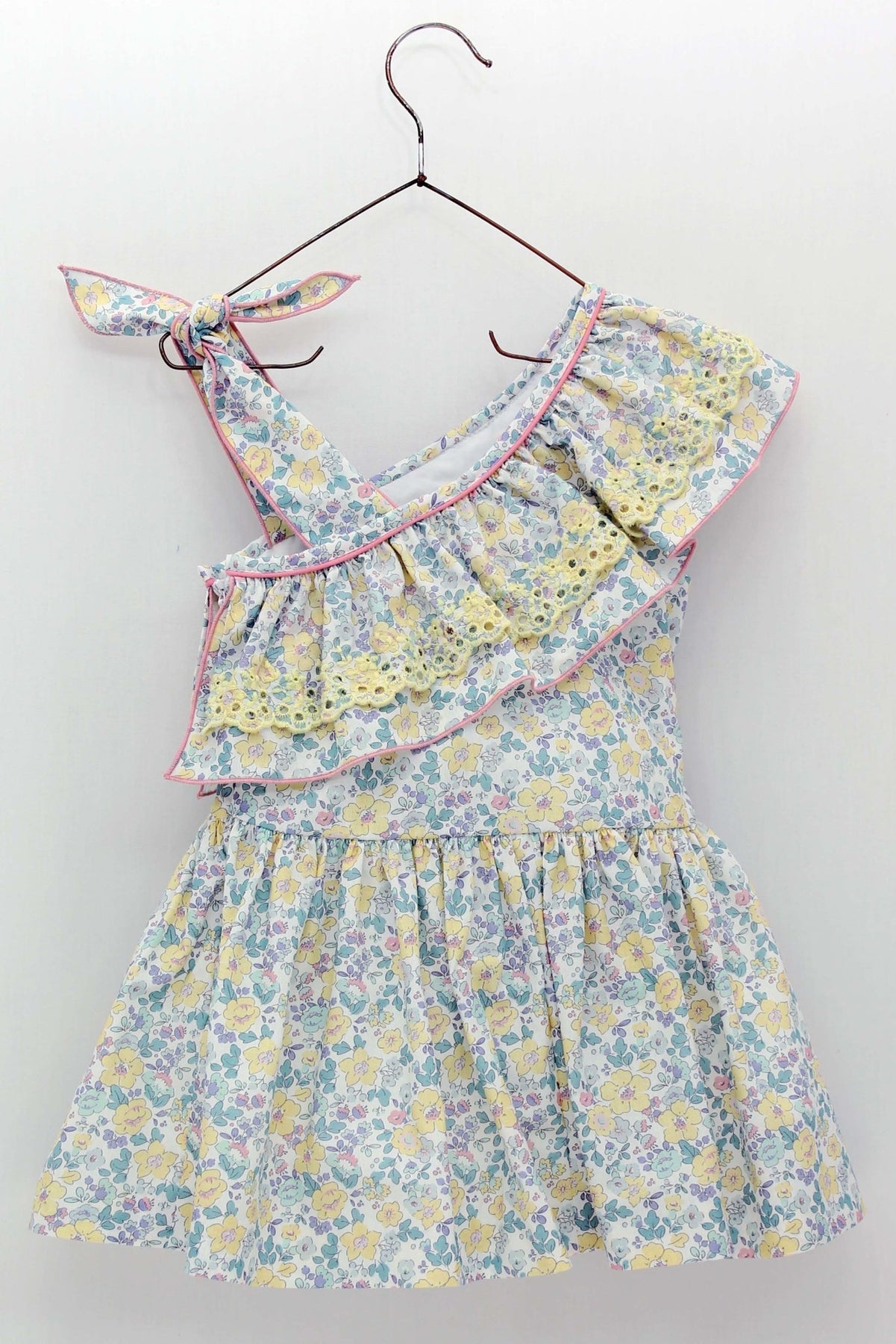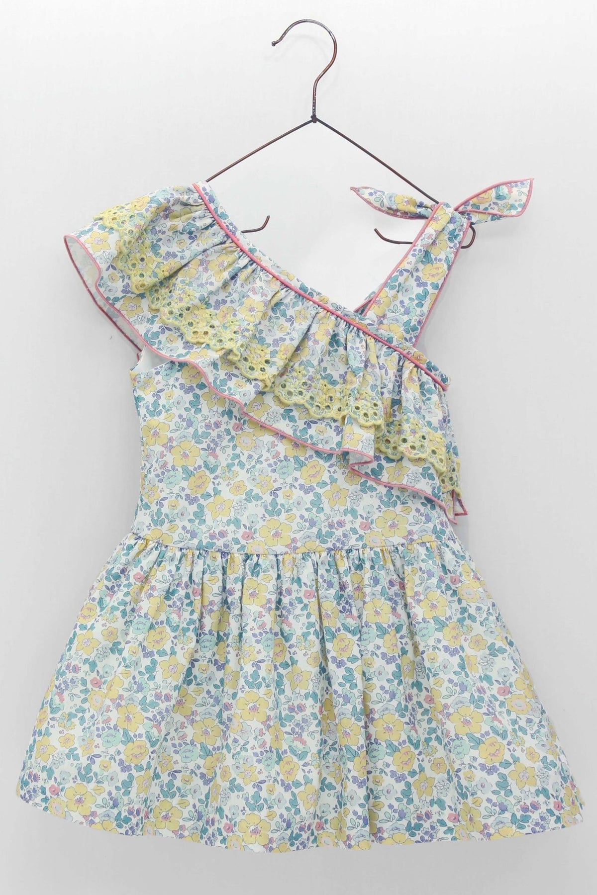 فستان بناتي مزهر من ماركة Foque الإسبانية. فستان زهري عتيق باللونين الأخضر المريمية والليموني بأكمام غير متماثلة مع كشكشة كبيرة على الجهة الأمامية.
