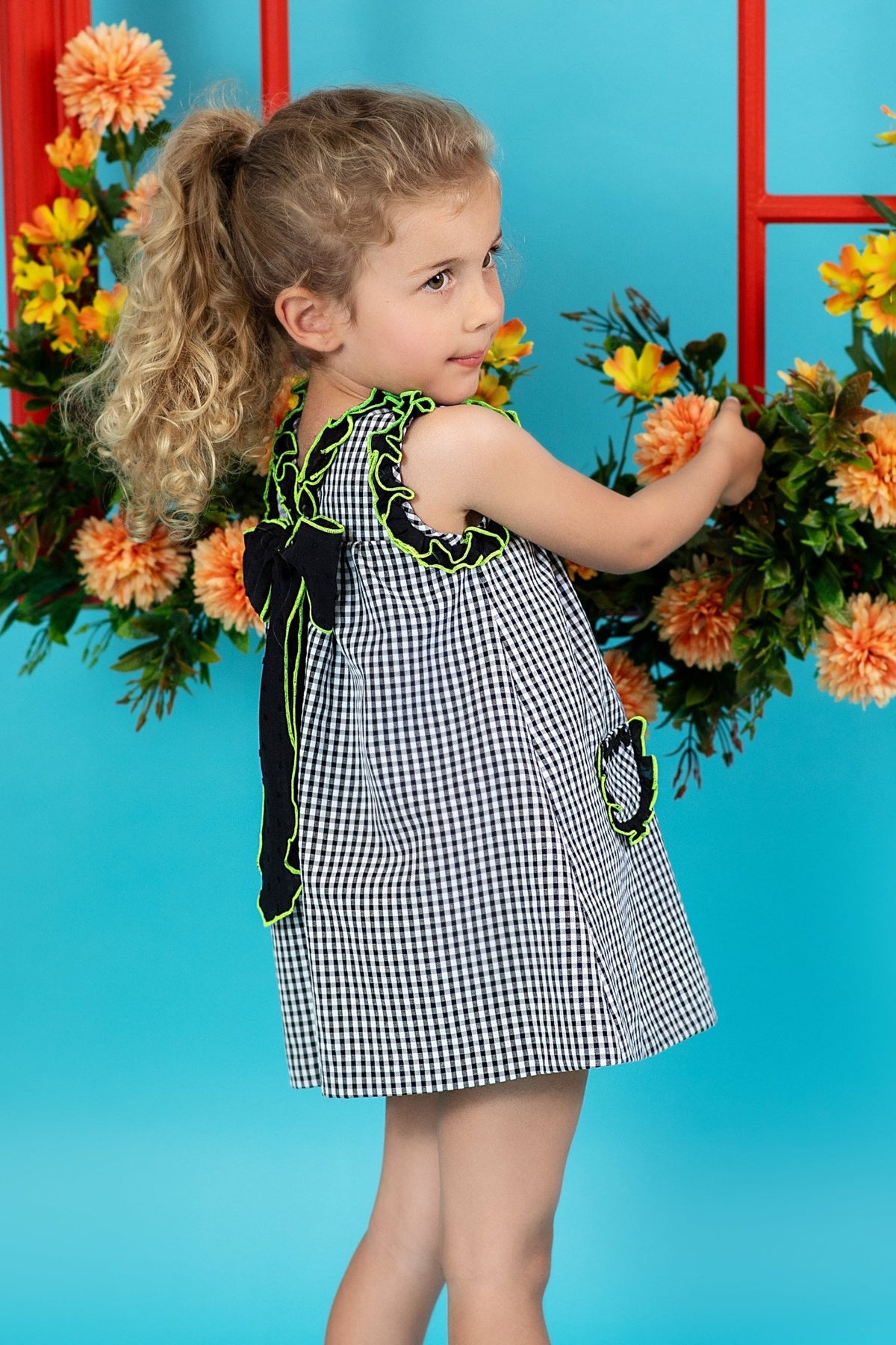 جريء وجميل، هذا الفستان المربع من فوك باللونين الأبيض والأسود، مفعم بأجواء صيفية مرحة. مصنوع من قطن سيرساكر فائق الخفة، يتميز بحواف مزينة بكشكشة بلون أخضر ليموني نيون وجيوب أمامية جذابة. يخطف الجزء الخلفي الأنظار بقصته على شكل حرف V الجريئة وعقدة سوداء كبيرة من قماش بلوميتي، محاطة بنفس اللون الليموني الكهربائي لإضفاء لمسة من الأناقة. سواء كانت في حفلة عيد ميلاد أو في الحديقة، سيخطف هذا الفستان الأنظار بالتأكيد.