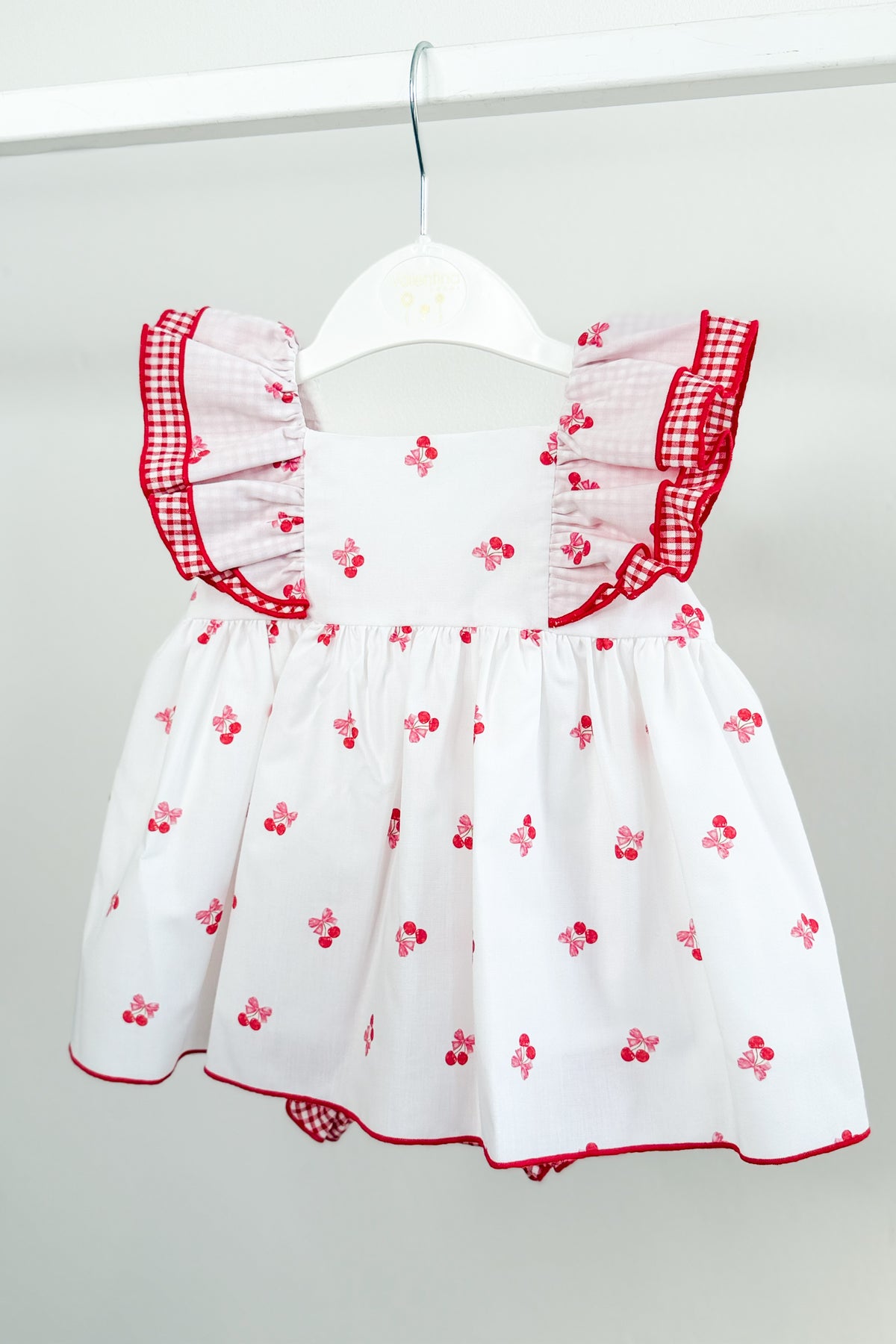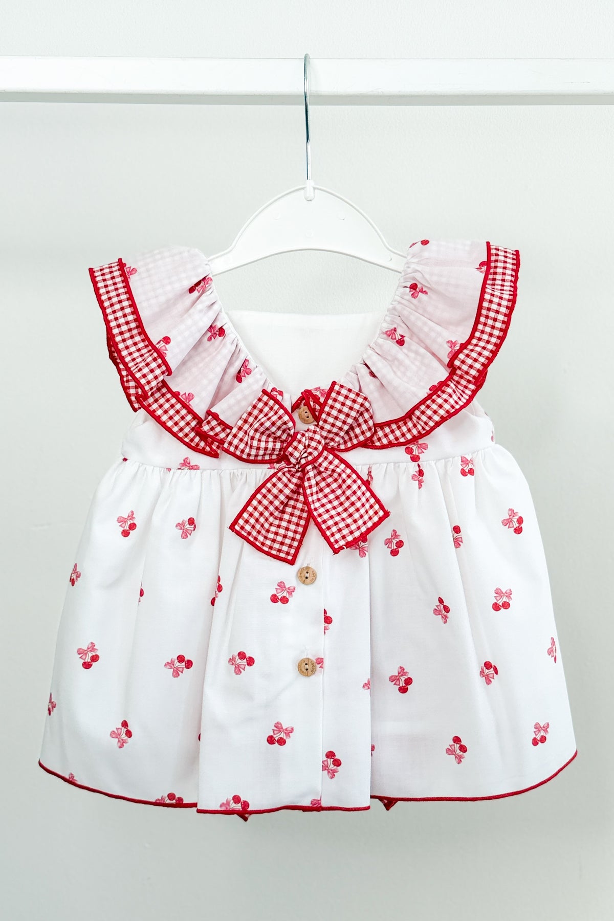 From Spanish brand Valentina Bebés, this beautifully detailed dress and bloomers set blends a soft, playful feel with timeless design. Crafted from lightweight woven cotton, the white base is scattered with delicate red cherry and bow prints, creating a fresh, summery look that feels both sweet and easy to wear.