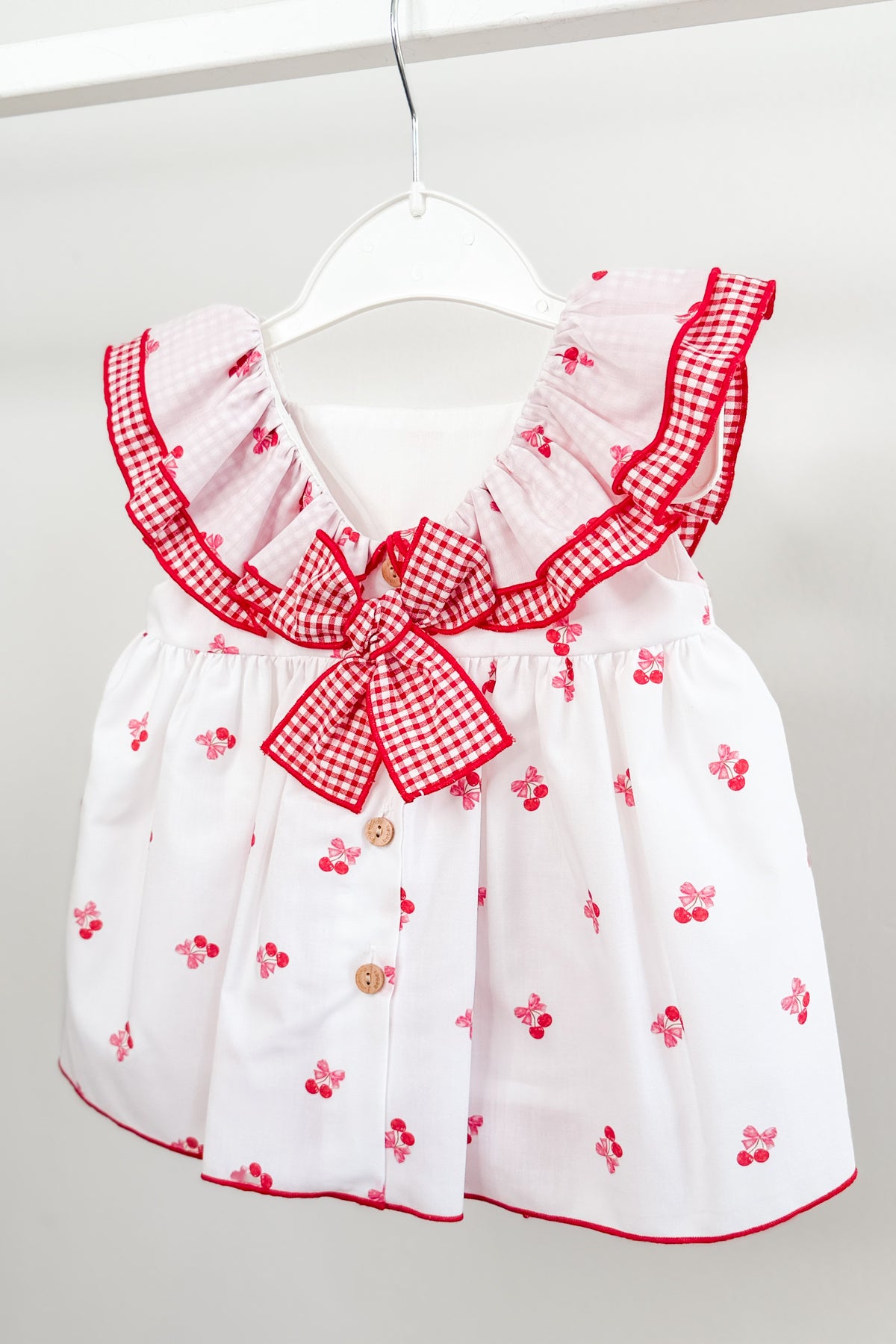 The softly structured silhouette is finished with double-layered ruffled sleeves for gentle volume and movement, while the back reveals a V-shaped design adorned with a statement red gingham bow. Wooden buttons run all the way down the back, adding a classic touch while making dressing simple and practical.