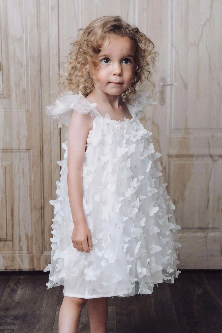 فستان تول للبنات من ماركة دوللي الهولندية من لو بوتي توم . فستان تول أبيض مبطن بالقطن بقصة A ومزين بفراشات ثلاثية الأبعاد. يتميز بأكمام أنيقة مكشكشة. مثالي للمناسبات الخاصة.