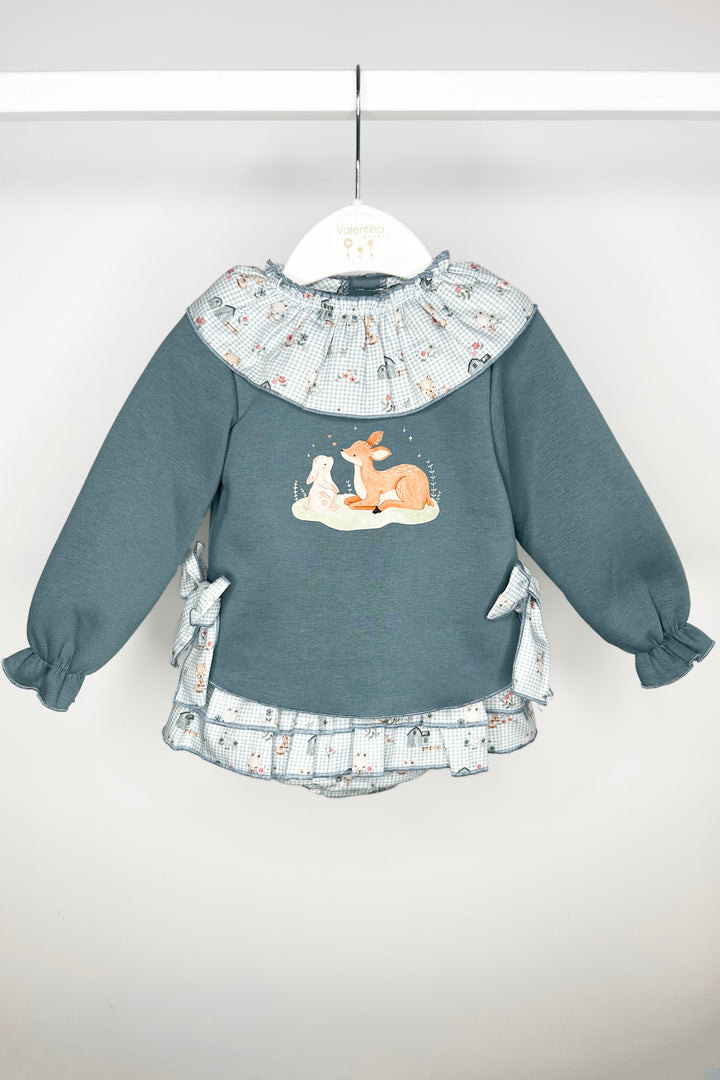 طقم ملابس لطفلة من ماركة فالنتينا بيبيز الإسبانية. سويت شيرت من قطن الجيرسيه فائق النعومة، متوسط الوزن، بلون أزرق مخضر، بياقة واسعة بنقشة جلد النمر، وطبعة جلد النمر على الصدر، وطبعة أرنب وغزال جذابة، مزينة بفيونكتين متطابقتين من نقشة جلد النمر على الجانبين، مع تنورة متعددة الطبقات بنقشة جلد النمر وسروال داخلي مخفي.