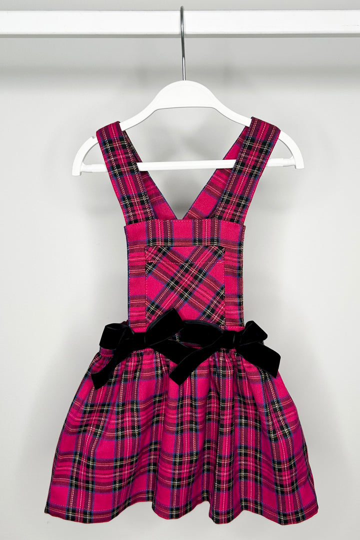 فستان مريلة للبنات من ماركة Phi Clothing البرتغالية. فستان مريلة ناعم متوسط الوزن، من قماش الترتان الوردي الفاتح، مزين بعقدتين كبيرتين فاخرتين من المخمل الأسود عند الخصر.
