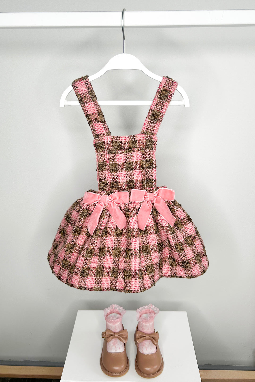 فستان بينافور بناتي من ماركة Phi Clothing البرتغالية. فستان بينافور سميك من التويد باللونين الوردي والبني، مزين بعقدتين فاخرتين من المخمل الوردي الداكن عند الخصر.