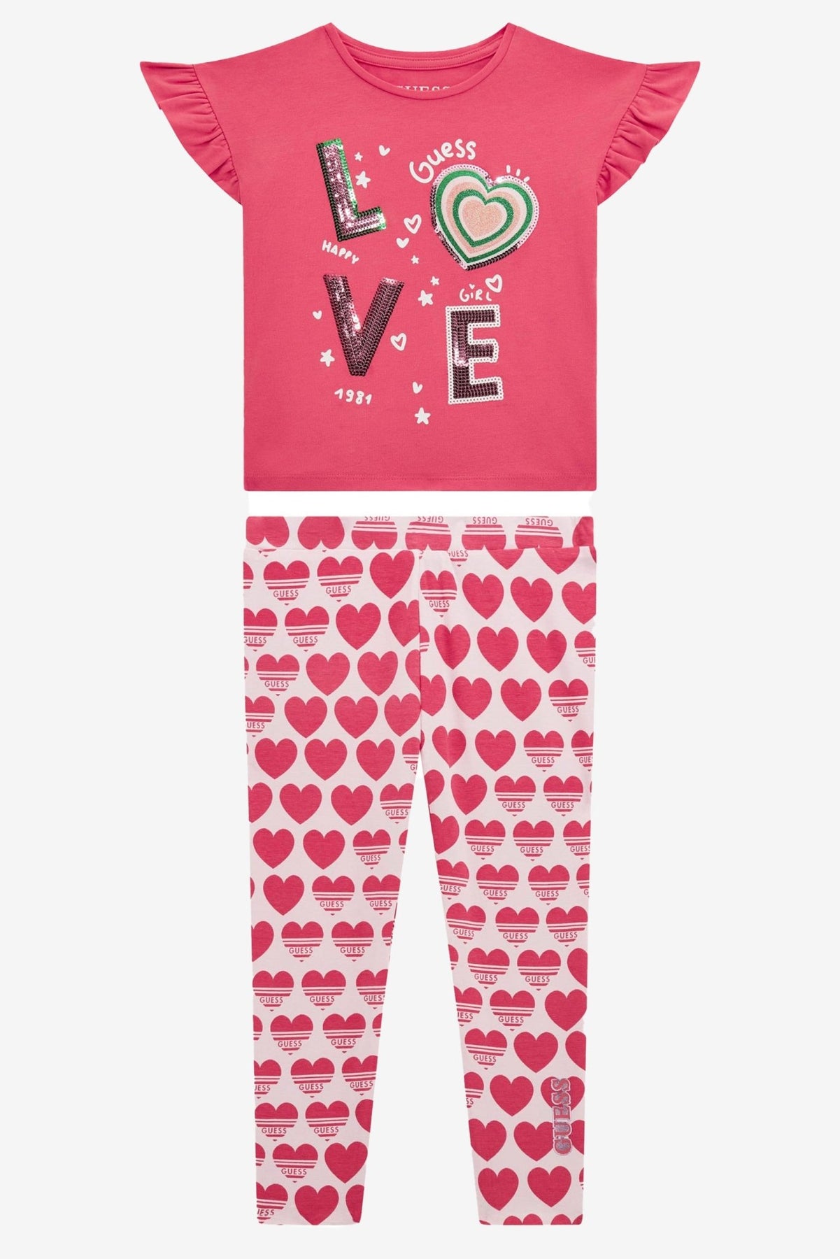 طقم مرح وجذاب من GUESS® Kids ، يتكون من تيشيرت وردي كرزي مع ليغينغز، مثالي لعشاق الموضة الصغار. يتميز هذا التيشيرت الناعم والخفيف والمرن بأكمام مكشكشة جذابة ونقش "LOVE" مبهر - أحرف L وV وE مرصعة بالترتر، مع قلب وردي وأخضر لامع يحل محل حرف O. يمكن تنسيقه مع ليغينغز مطابق بطبعة قلب، قابل للعكس بذكاء، ليمنحكِ خيارًا ثانيًا للتنسيق مع جانب وردي كرزي سادة. صُمم هذا الطقم بحزام خصر مطاطي لراحة طوال اليوم، وهو أنيق وعملي في آن واحد.
