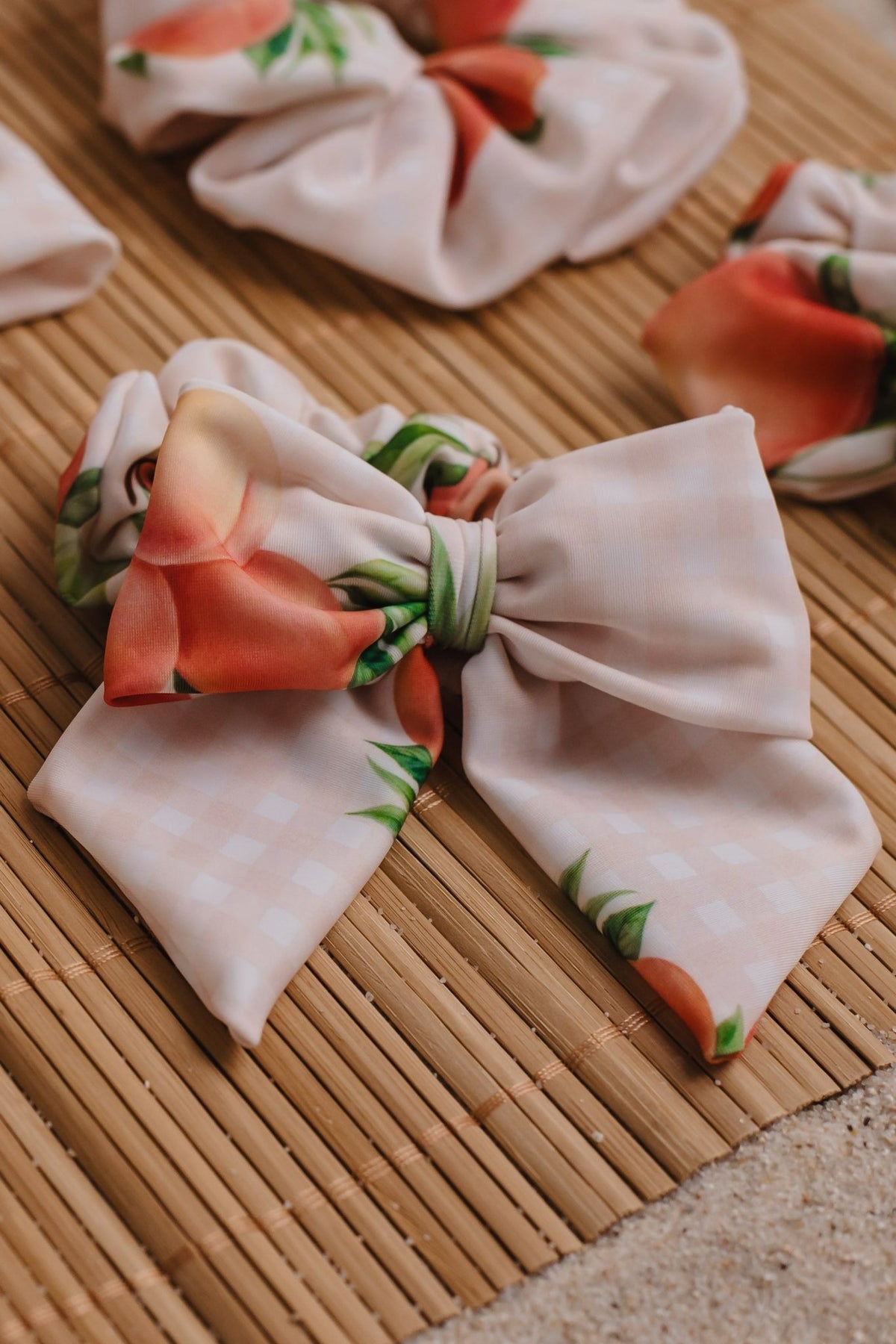 ربطة شعر بناتية مزينة بفيونكة من ماركة ميا باتا البرتغالية. ربطة شعر ناعمة جدًا من الليكرا بنقشة مربعات خوخية وبيضاء، تعلوها فيونكة كبيرة.
